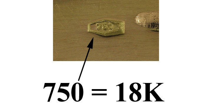 The pin is marked on the reverse with Italian gold hallmarks including 750 for 18K gold, except for this hallmark all the other hallmarks appear to have been deliberately removed. Not sure the reason for this but it has no effect on the pin. We have tested the pin with nitric acid and guarantee it to be 18K gold.