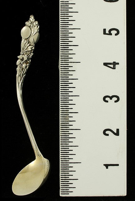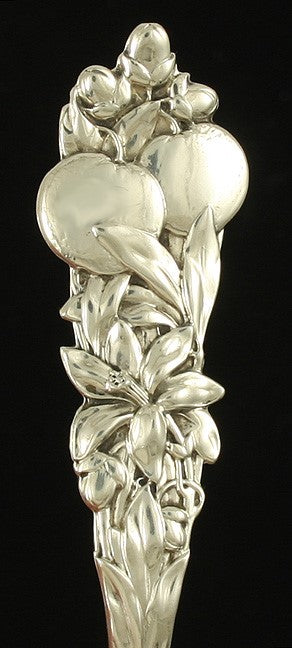 Presented is a pretty sterling silver small sauce ladle made by Durgin. This piece is in the Orange Blossom pattern, which was patented in 1898. The handle is beautifully cast with oranges, flowers and small blossoms.