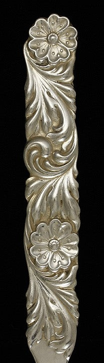 Presented is a handsome set of sterling silver salad servers by the Boston maker, Silvercraft. The servers are done in an attractive pattern of flowers, scrolls, and leaves. These two pieces could of course be used individually as large serving pieces. They are generously sized and have great weight.