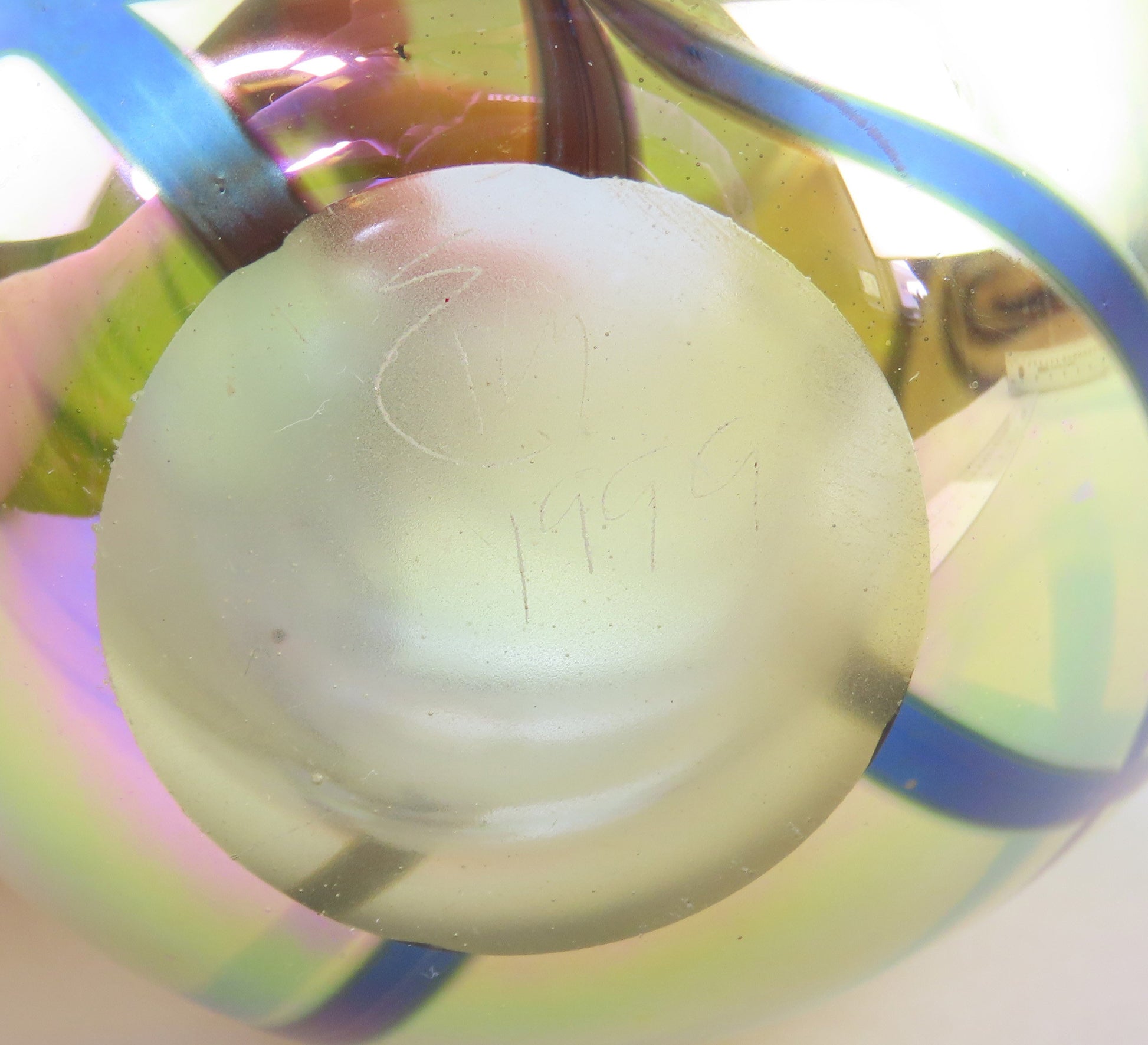 Artisan Iridescent Hand Blown Glass Vase 1999 Gold w/ Cane Swirls