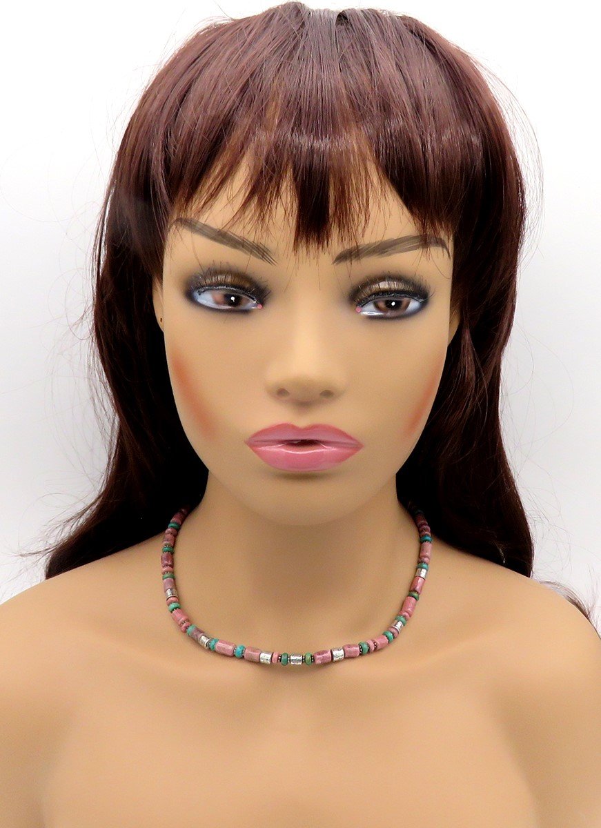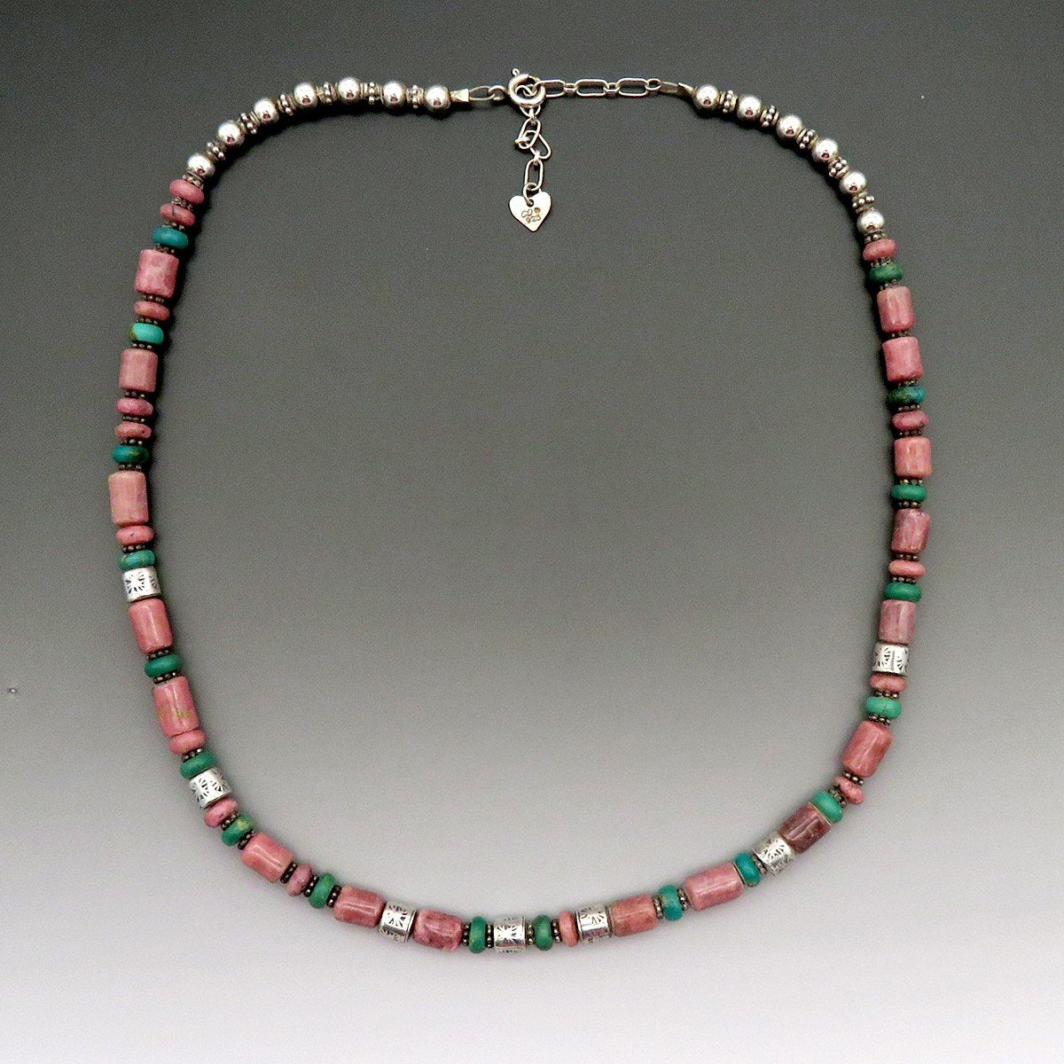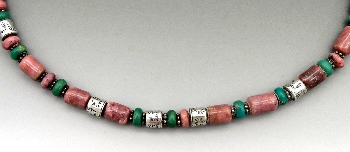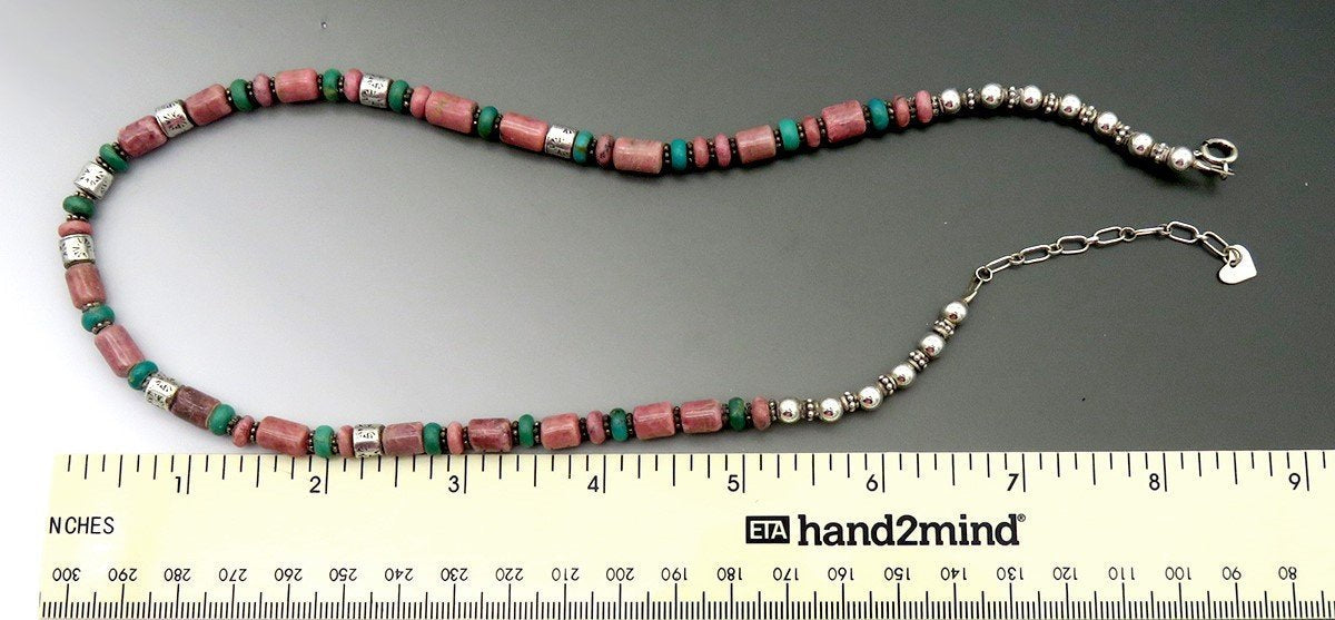 Presented is a hand crafted gemstone and sterling silver beaded necklace. The choker or collar length necklace is comprised of pink rhodonite and green turquoise polished gemstone beads in various shapes as well as sterling silver spacers and punchwork beads. The punchwork on the cylindrical sterling beads looks Native American in design. The necklace has a springring style clasp and a length of chain at the opposite end so it can be adjusted to a variety of lengths.