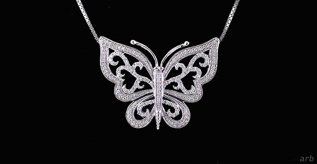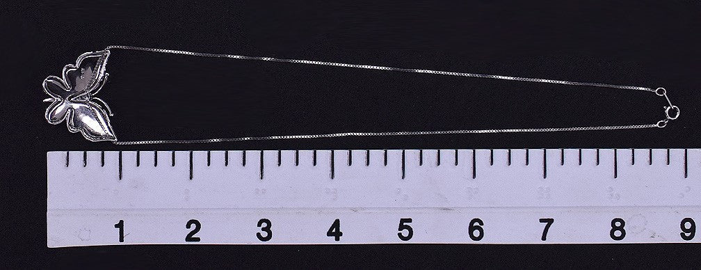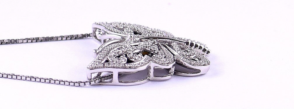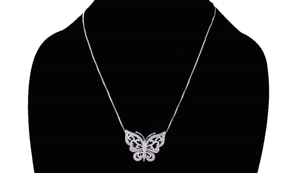 The necklace consists of a beautiful diamond-studded butterfly pendant and a silver box-style chain.
