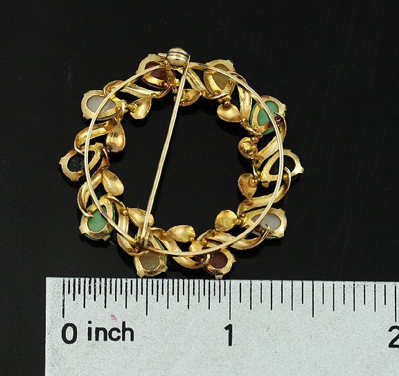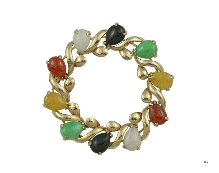 Attractive 14k Gold Multi-Color Jade Wreath Pin Brooch