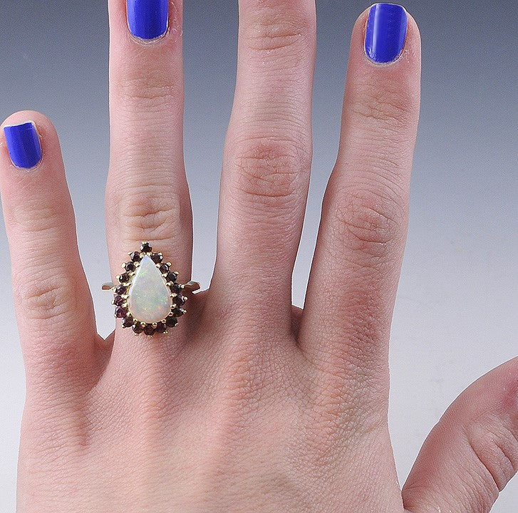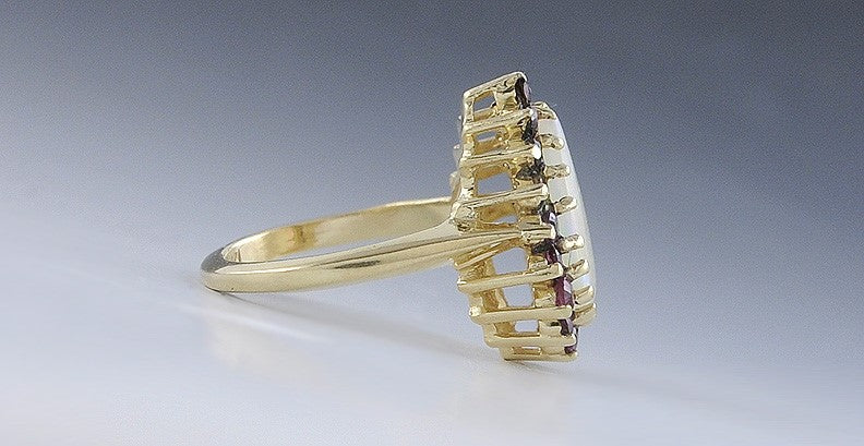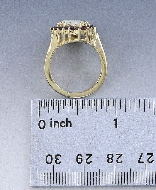 Attractive 14K Gold Ring w/ Teardrop Opal & Rubies Halo Cocktail Ring Size 6.75