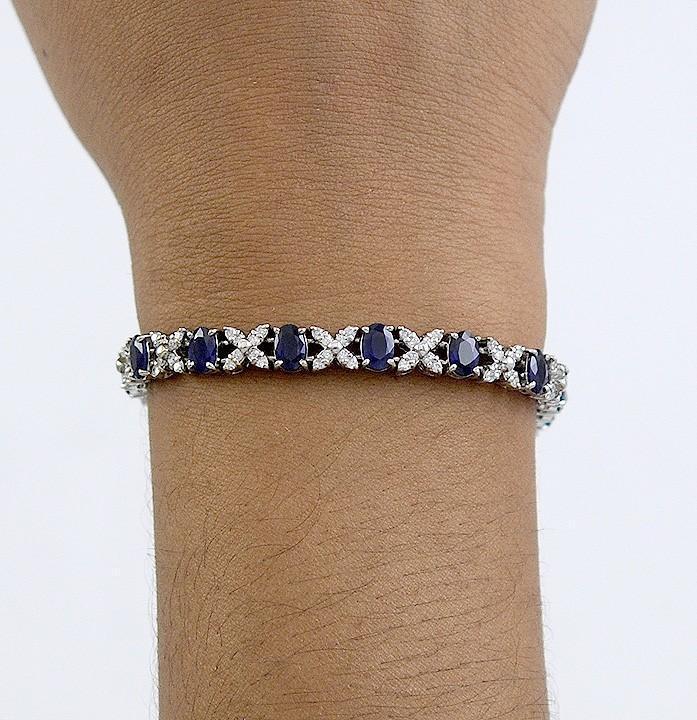 Presented is a striking and modern, 14 karat white gold, sapphire and diamond bracelet. The bracelet is comprised of links of securely prong set sapphires and diamonds in an X form mounting. There are 17 sapphires in total, each one measures about 5.9 by 4.3 by 2.6 millimeters and is approximately 55 points. There is approximately 9.35 carats in total sapphire weight. There are 136 modern, brilliant cut diamonds at about 1 point each so there is over 1.25 carats in total diamond weight in this bracelet. The diamonds are SI-2 to I-2 clarity and are I color. The plunger style clasp is secure and has a safety latch for added security. This bracelet is well constructed and moves nicely.