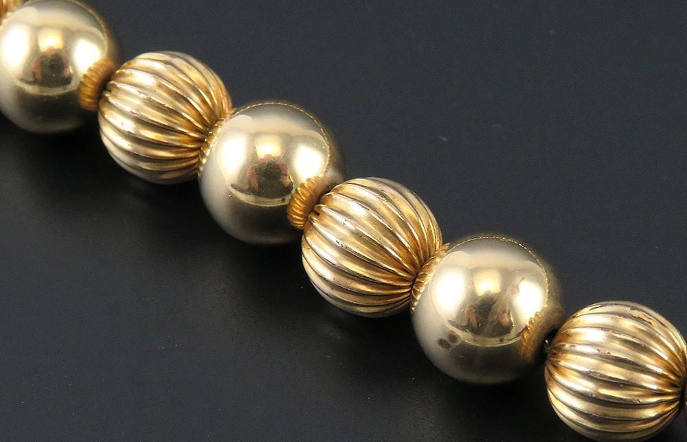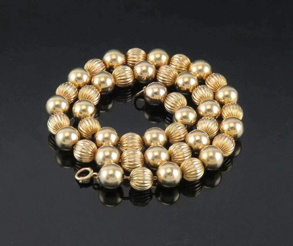 Presented is a wonderful quality, 14 karat yellow gold beaded necklace. The chain of the necklace is 14 karat gold and is strung with alternating glossy and textured 14 karat gold beads. The spring ring clasp is secure.