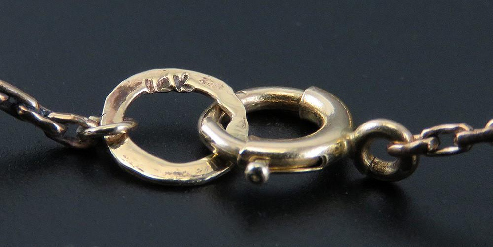 The clasp is marked 14K. Tested and guaranteed to be 14 karat gold purity.