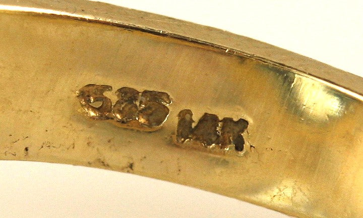 The ring is stamped 585 14K on the inside of the band. We have tested it with nitric acid and guarantee it to be 14K gold.