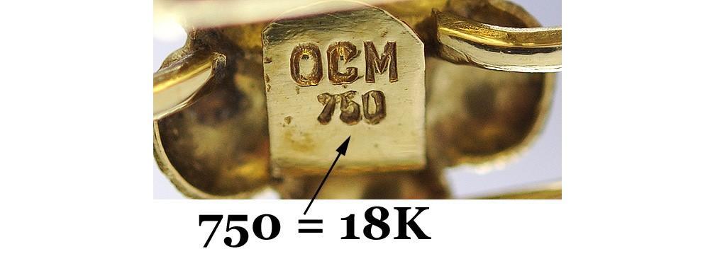 The back is marked OCM for the maker and 750 for 18 karat gold purity. All parts have been tested and are guaranteed to be 18k gold.