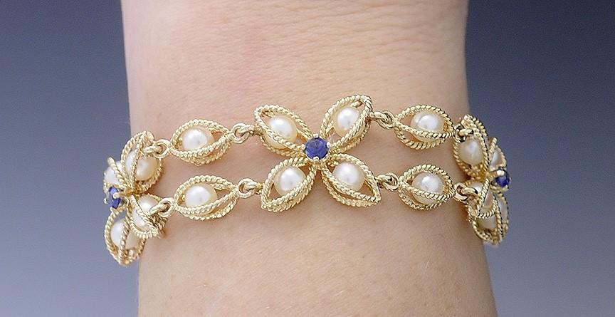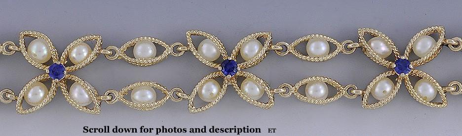 Beautiful 14k Gold Pearl & Sapphire Wire Flower Form Bracelet