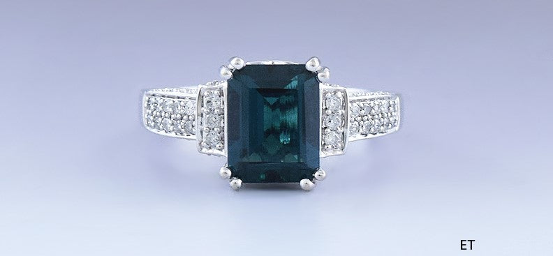 Presented is a beautiful 14 karat white gold, diamond and green gemstone ring. This is a modern ring, likely of American make. The ring is set with an emerald cut lab created emerald, measuring about 9 by 7 by 4.5 millimeters. The shoulders of the ring are set with 30 diamonds, totaling about 20 points in carat weight, very vibrant and dazzling stones. The ring is very well made and attractive, with appealing openwork on the sides and back of the setting. The ring setting would be easy to set with a similarly cut and sized stone of your choice.