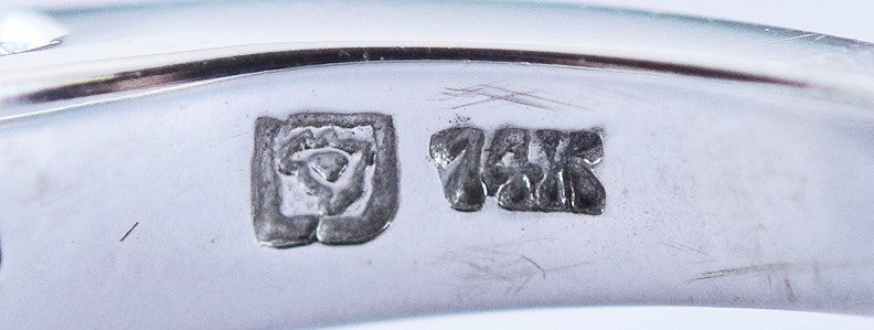 The band is stamped and guaranteed 14k and has a maker's mark we unfortunately do not recognize.