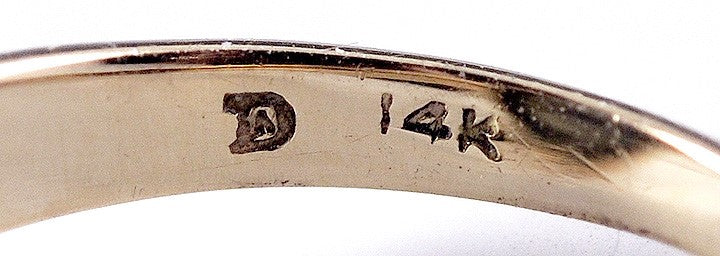 This piece is stamped and guaranteed 14k, as well as having a maker's mark that looks like a D. We have tested the white portion with nitric acid and guarantee it to be 18 karat gold. The ring is a size 6. The head of the ring measures about 14.3 millimeters north to south, while the band is about 1.8 millimeters wide at the narrowest point. The ring weighs 3.7 grams.