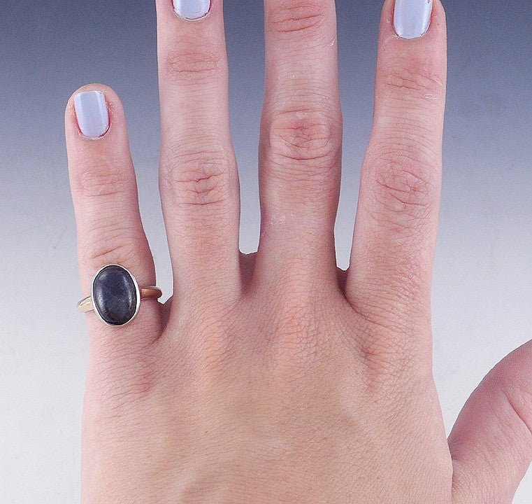 The ring is in good overall condition. The labradorite stone is securely set. It has some minor surface abrasions, and a smooth chip in the 6-7 o'clock position as can be seen in the first photo. The band has no breaks and no repairs.