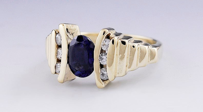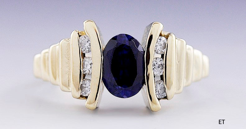 Presented is a lovely sapphire and diamond ring in 14 karat gold. This is a fairly modern ring, probably of American make. The ring is set with an oval cut sapphire of about 80 points in size. This is a real mined-from-the-ground stone, with gorgeous rich blue color. Channel set on either side of the sapphire are 3 diamonds (6 total) of about 2 points each in size. These are vibrant, dazzling stones, complimenting the sapphire nicely. The gold setting is done in an interesting stepped design, very visually appealing.