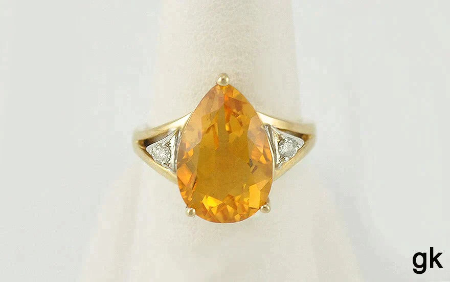 The citrine is in a tear drop shape and measures 14.5 mm long and 10.2 mm