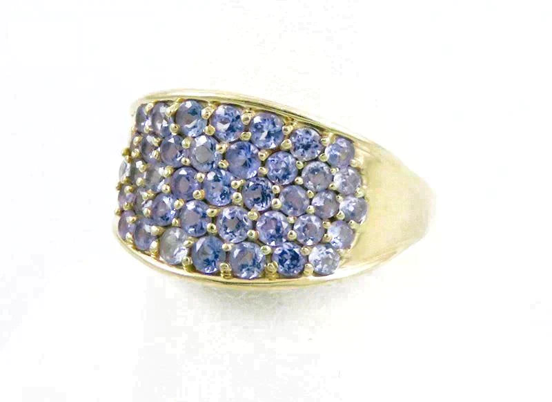 Presented is a gorgeous, 14 karat yellow gold and genuine tanzanite gemstone statement ring. The band is graduated in size and the thick top is securely set with 39 natural, well-matched tanzanite gemstones. The ring is a size 7 and can be resized by a professional jeweler.