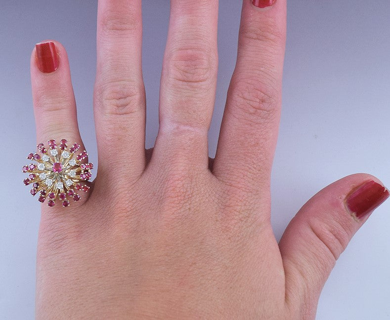 Beautiful 14k Yellow Gold Red Ruby & Diamond Cluster Ring Size 5.5