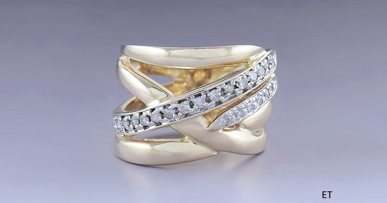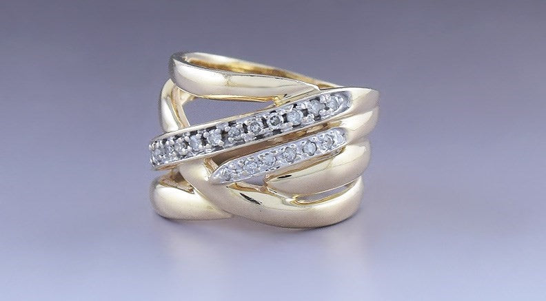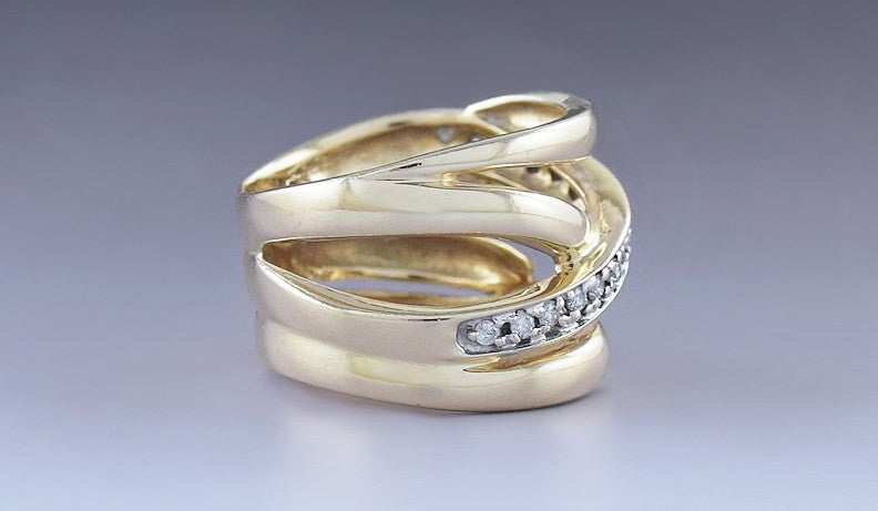 Presented is a very pretty, 14 karat yellow gold and diamond ring in a size 7. The ring is done in a unique, openwork band form. The top is set with 22 diamonds. The nicely cut diamonds are approximately 1 point in size each and they catch the light beautifully.