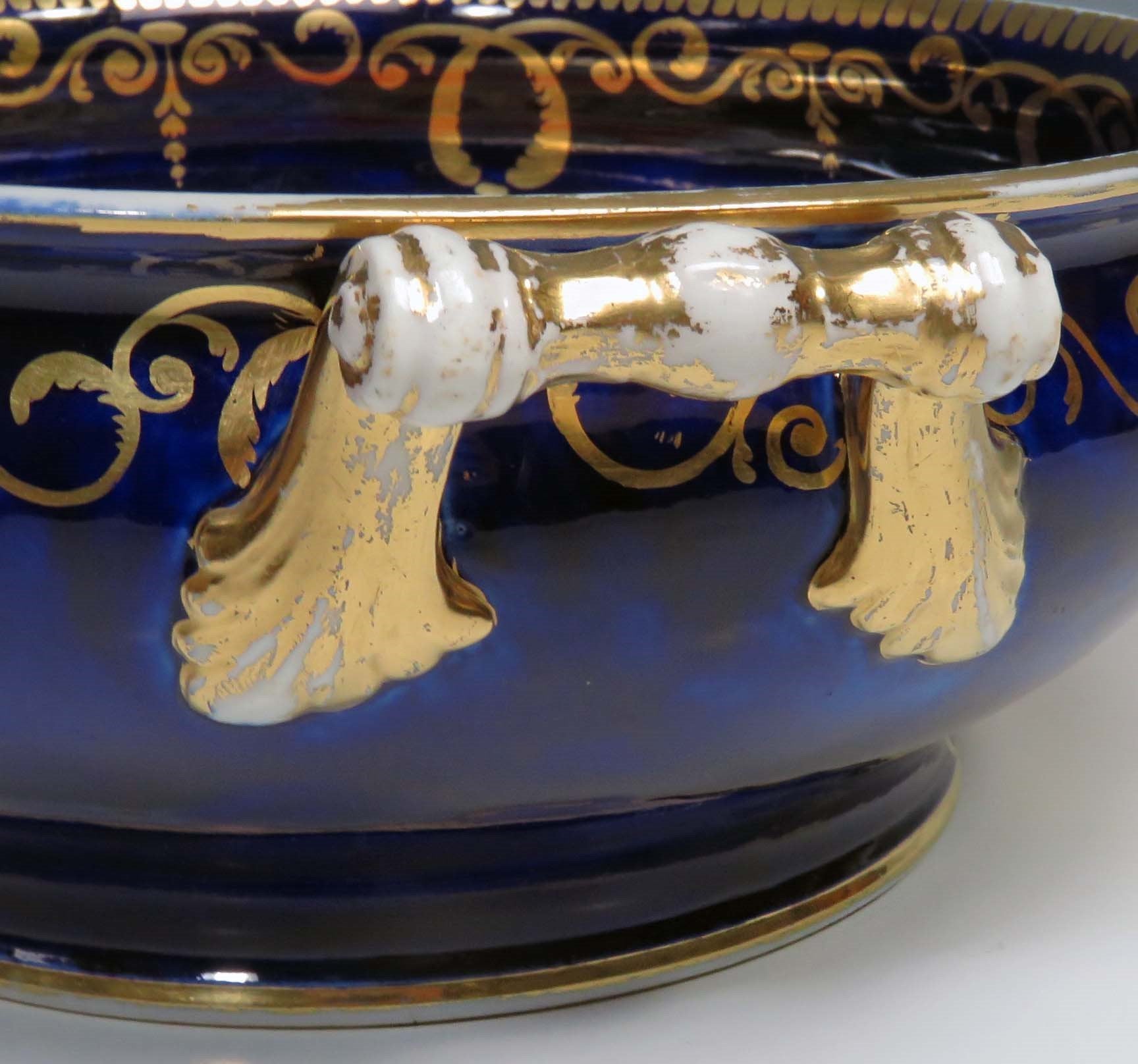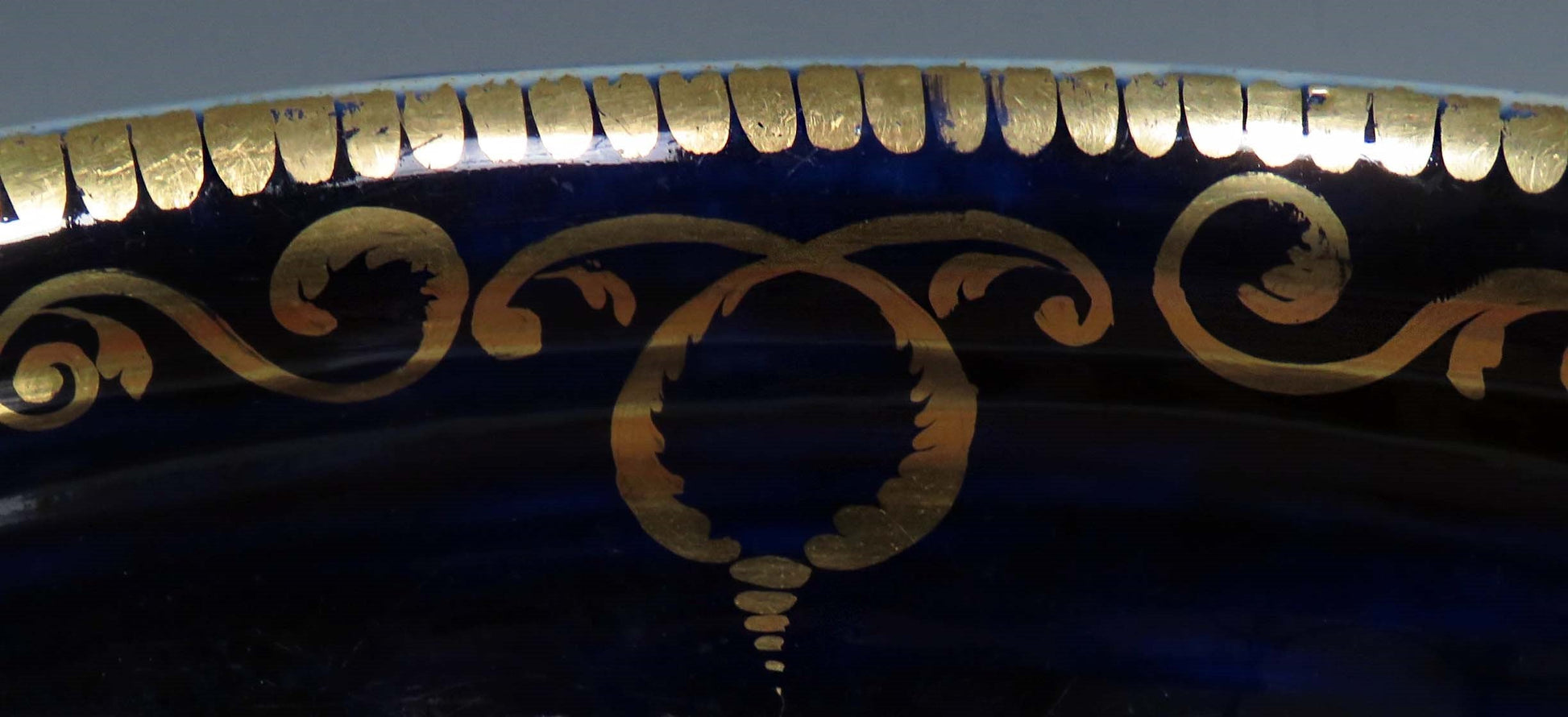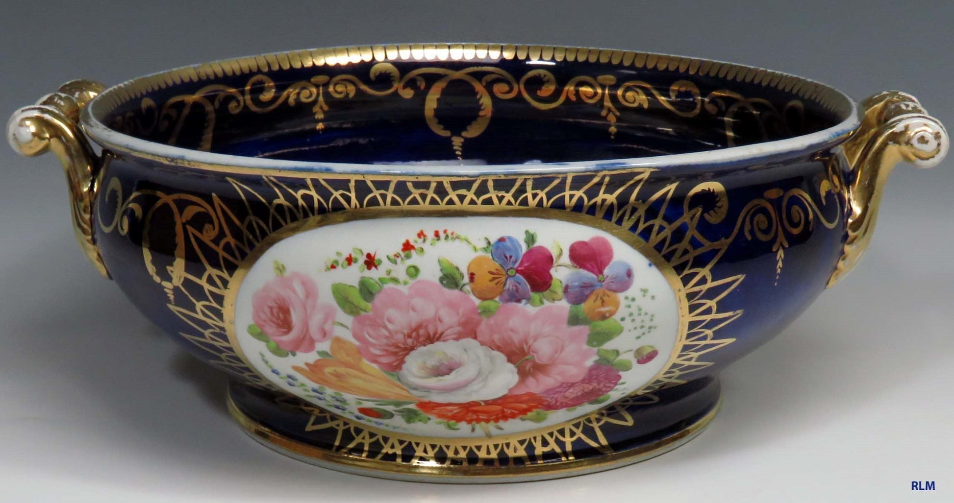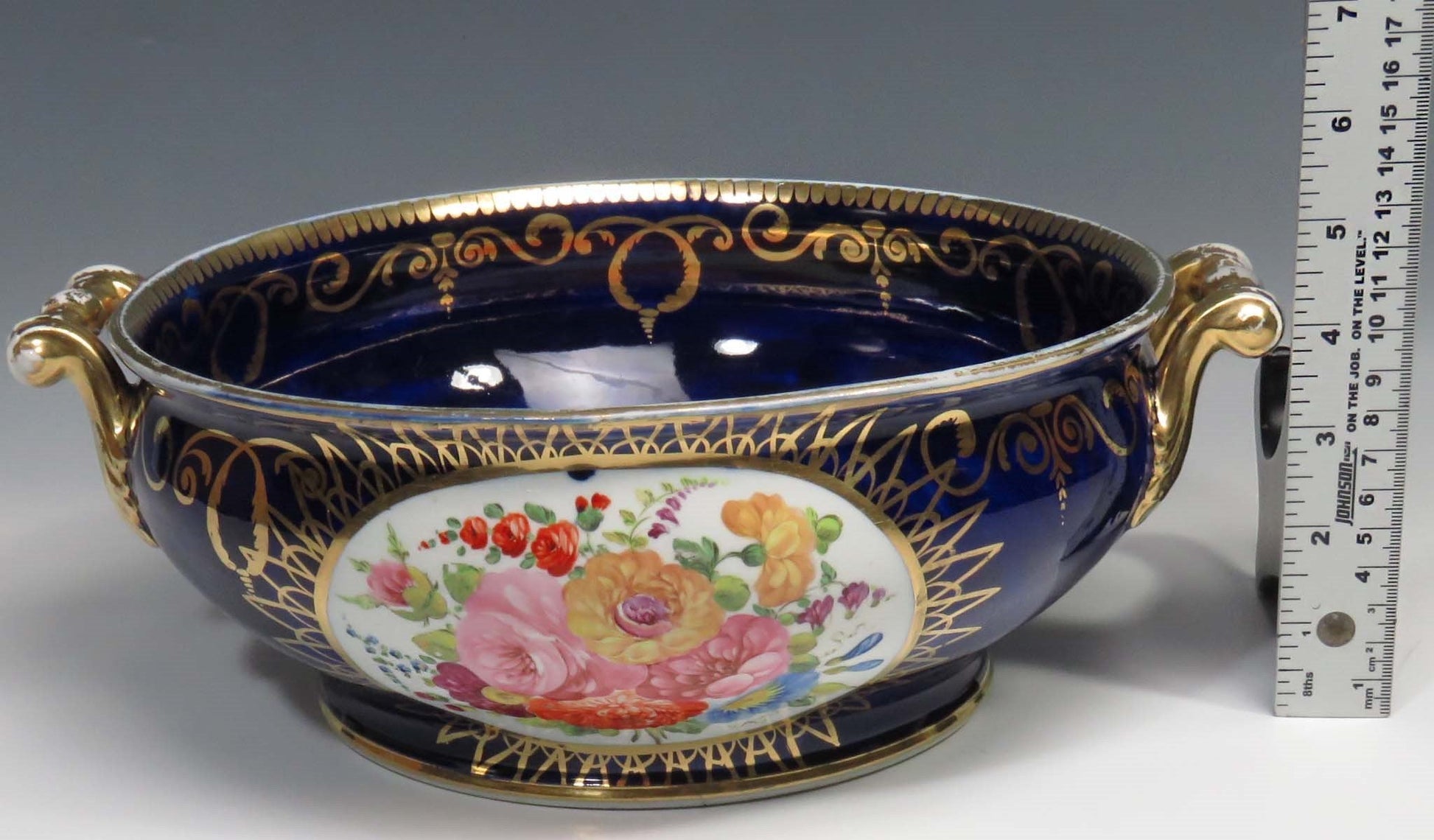 Presented is a nice antique French or English porcelain blue bowl. This bowl has a beautiful floral design throughout. There is gold accents throughout this piece. We believe this bowl is French or English. This is a nice size piece that is well made. Let the photos be your guide. The bowl was made between the 1750's-1770's.