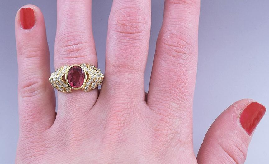 Presented is an eye-catching 18 karat gold, pink tourmaline and diamond ring. This is a modern ring, likely made in America. The ring is set in the center with an oval cut pink tourmaline, about 2 carats in size. This is a real, mined-from-the-ground stone, verified by our gemologist, with gorgeous bright pink color. Set on either side of the tourmaline in a wavy chevron formation are 21 modern brilliant cut diamonds (42 total) averaging about 2 points each in size, for a total diamond weight that is at least three quarters of a carat if not a full carat. The diamonds are vibrant, dazzling stones of VS clarity and H color.