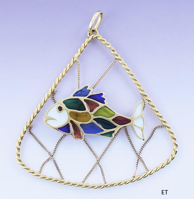 Beautiful 18k Gold & Plique A Jour Enamel Fish in Net Pendant