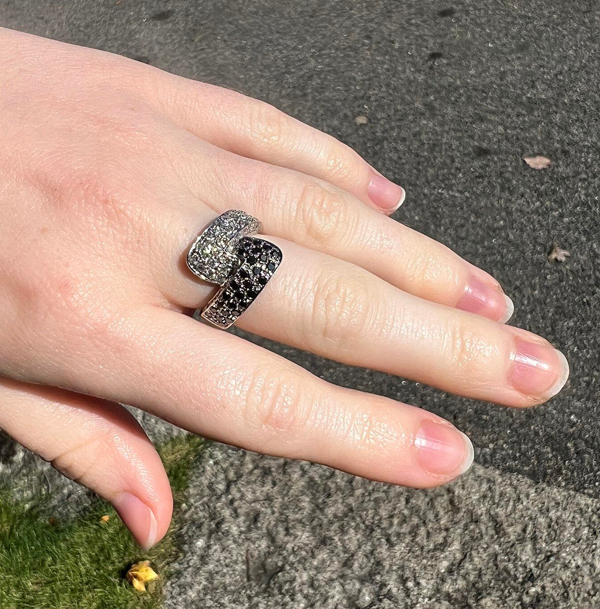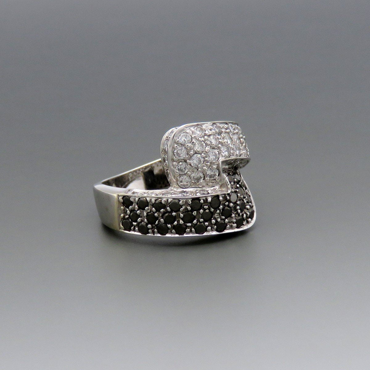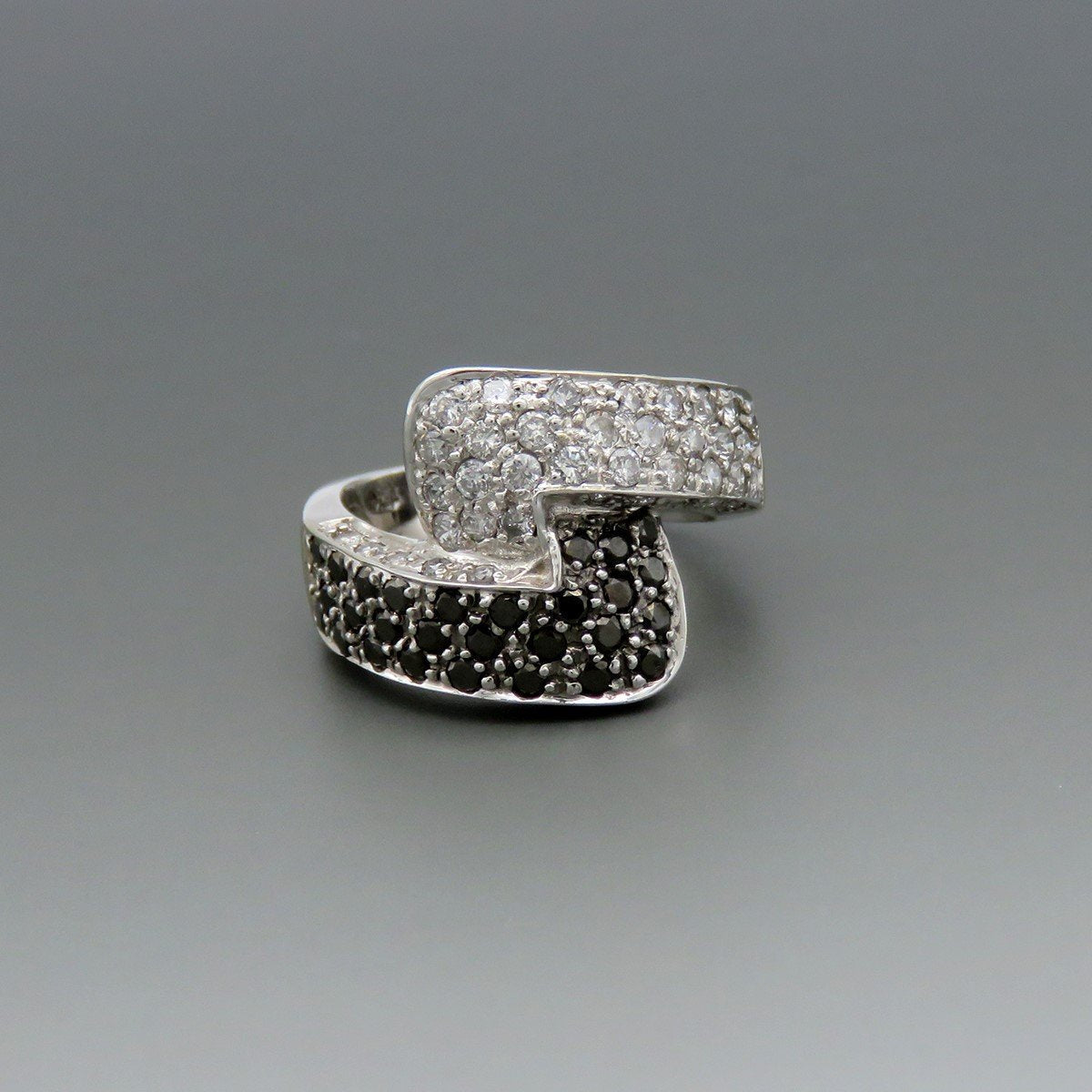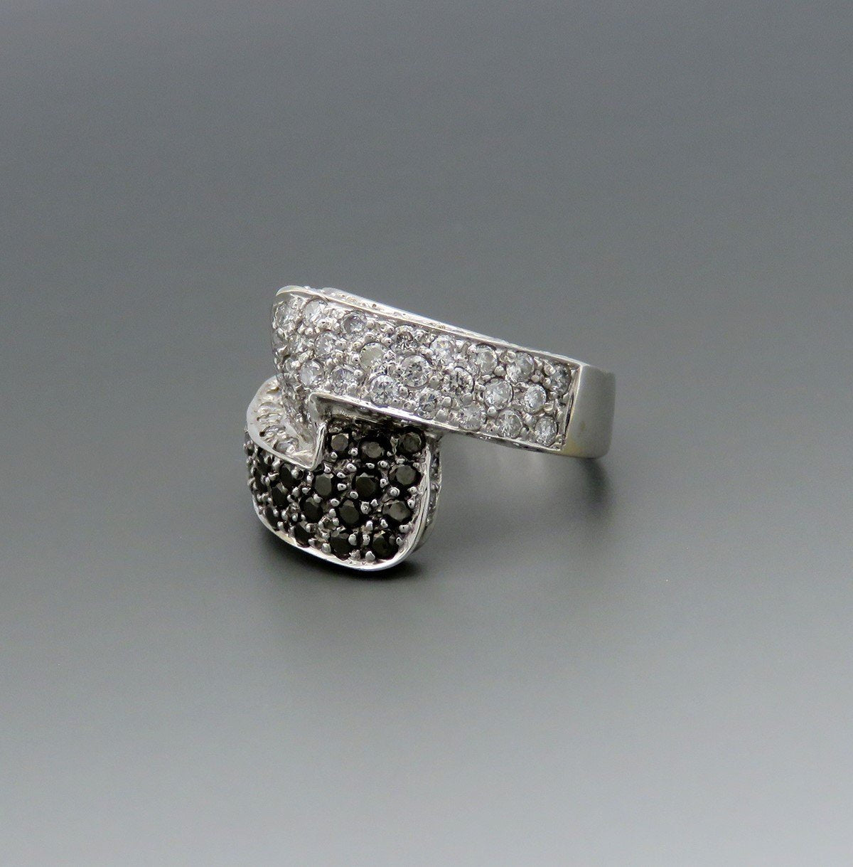 Presented is a stunning 18 karat white gold and diamond ring. This is a relatively contemporary piece and was likely made in America. The ring is made in an attractive interlocking bypass type design, with one part set with white diamonds and the other set with black diamonds, giving almost a yin yang type of effect. The side set with white diamonds has 28 on the top face as well as 32 additional white diamonds adorning the sides of the ring, all modern brilliant cut stones full of life and fire, at least 2 points each in size. The part set with black diamonds is set with 28, likewise at least 2 points each in size. This gives the ring a minimum of 1.2 carats in white diamonds, and 56 points (.56ct) in black diamonds. We give diamond weight estimates on the conservative side, to comply with eBay's Authentication program, but we believe the total diamond weight to be higher than what our estimates indicate.