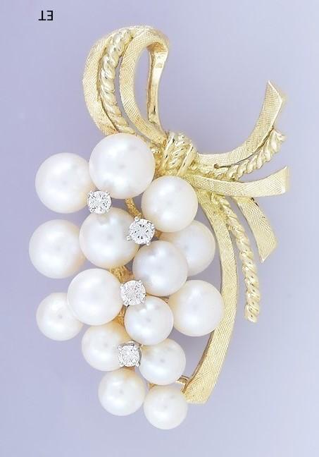 Presented is a fabulous 18 karat yellow gold, pearl and diamond brooch or pendant. The pin is made like a stylized cluster of grapes, set with 15 beautiful pearls, ranging in size from about 4.7 to 7 millimeters in diameter. The pearls are very lovely, well matched in their silvery tone and featuring striking pink overtones. Prong set among the pearls are four modern brilliant cut diamonds, totaling about 8-12 points in weight at a VERY conservative estimate. The setting is very well made from solid 18 karat gold, with a ribbon design above the pearls. The back has a rollover style safety clasp, so this piece can be worn as a brooch, but the ribbon design at the top doubles as a bail/loop for a chain, with interior measurements about 7.6 by 3.8 millimeters.