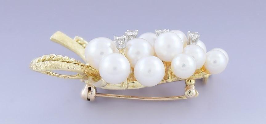 This pin is in excellent condition. The pearls are all securely mounted and are very clean. The diamonds are well set and all intact. The clasp functions well and closes securely.