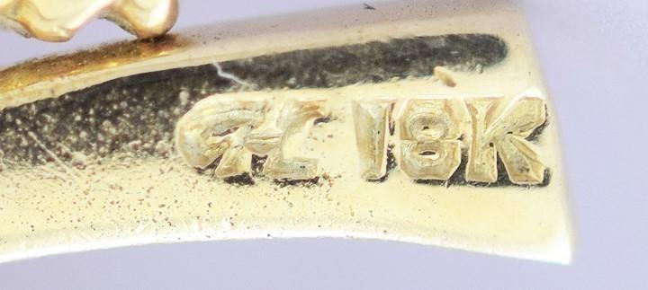 This piece is stamped 18k, nitric acid tested and guaranteed. There is also a maker's mark, possibly GHL conjoined.