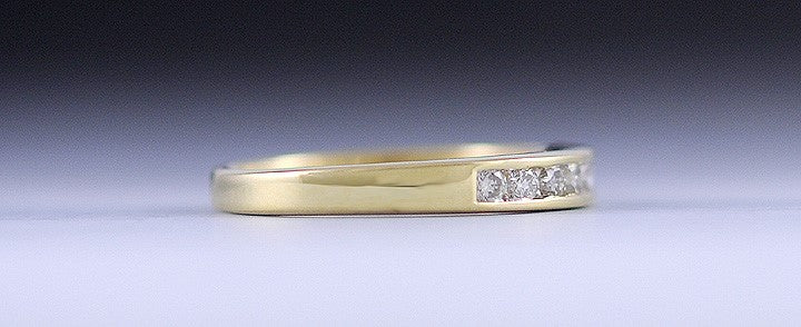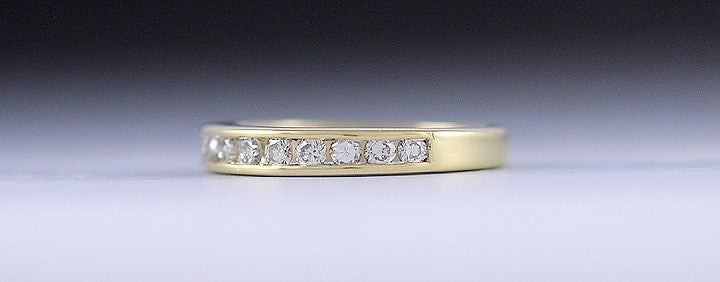 Presented is a lovely, 18 karat deep yellow gold ring in a size 5 1/2. This ring can easily be resized if need be. The front of the ring is securely channel set with 10 modern brilliant cut diamonds. The stones are 3-4 points each (30-40 points of total diamond carat weight) and they are SI or better quality and H-I-J color.