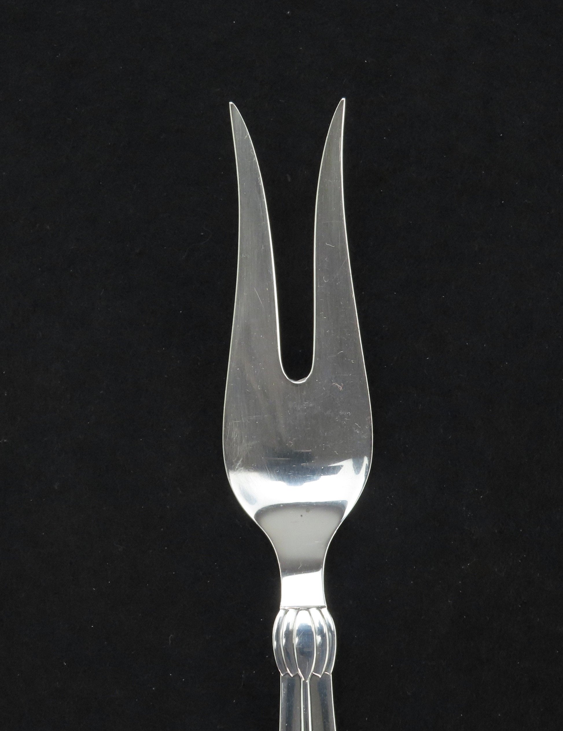 Presented is a beautiful Danish silver two tine serving fork, dated 1951. The handle of the fork features a finely executed design of a butterfly and flower, nicely detailed and done in an openwork style. The fork is a good size and well crafted, with a nice feeling of weight in the hand. Perfect for serving baked potatoes, roasted meats, or whatever else you like.