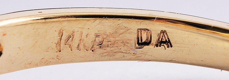 The ring is stamped 14kp for 14 karat plumb, where plumb means exact. The ring is also marked DA, probably a maker's mark.