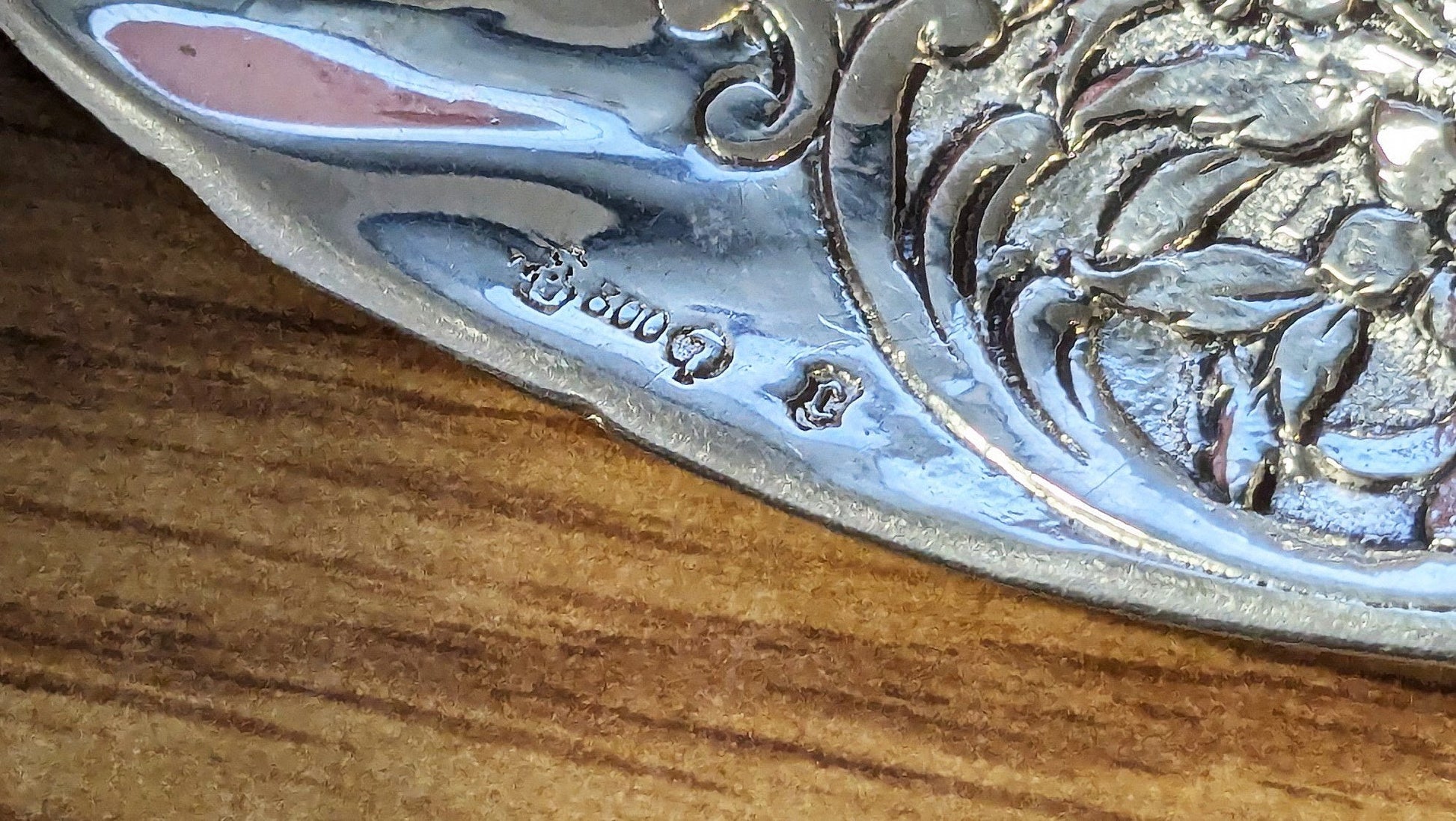 The bowl of the spoon is stamped in the bowl with the German crescent and crown mark including 800 for the purity of the silver, as well as a maker's mark for J. D. Schleissner & Sohne. The C mark is unidentified.