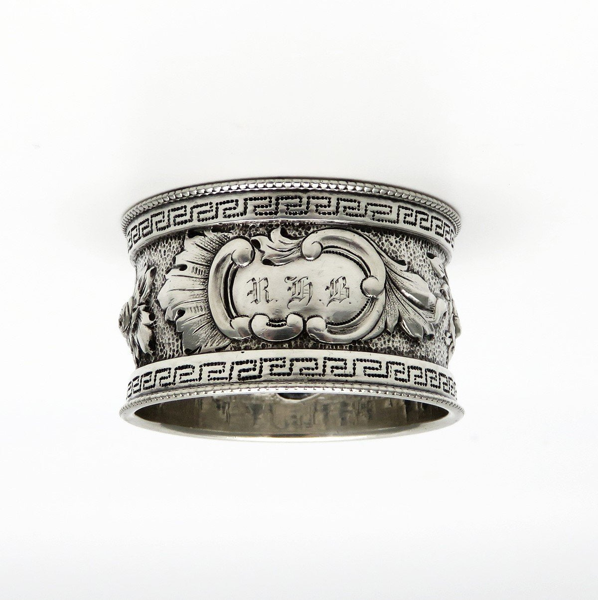 Presented is a wonderful antique American coin silver napkin ring, dating to around the 1850s-1860s. The napkin ring is beautifully hand cased with a design of roses and scrollwork, against a stippled texture background. The rims have a finely engraved Greek key or meander design, with a beaded border. One side has a scroll-enclosed cartouche, with a monogram of RHB in detailed Gothic lettering, while another cartouche on the reverse simply has the number five; presumably this napkin ring was part of a set. The silver of the cartouches is quite thick, and one or both of these engravings could be removed and replaced without weakening the silver too much. The quality of the hand chasing and decoration is exceptional, very detailed and well executed. Really a very handsome piece.