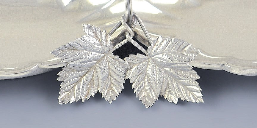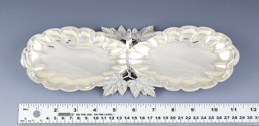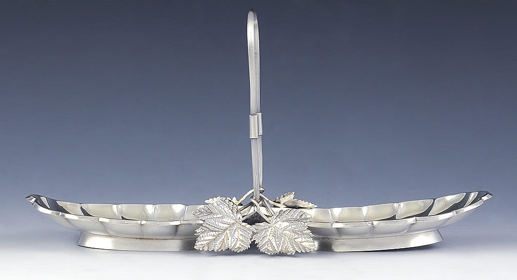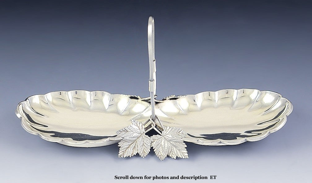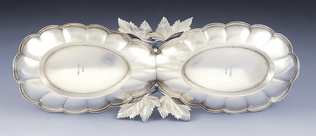 Presented is a great quality sterling silver serving dish by Wood & Hughes. This piece dates to around the 1870s. The dish is done very much in the style of the Aesthetic Movement time period to which it dates. The piece is done in the form of two scalloped dishes joined in the middle. On either side are leaf form decorations, done in a wonderful realistic style, complete with texturing and veining. The undersides of the dishes have a matte finish. Use this piece for serving little cakes, candy, for holding cards, or for anything else you like.