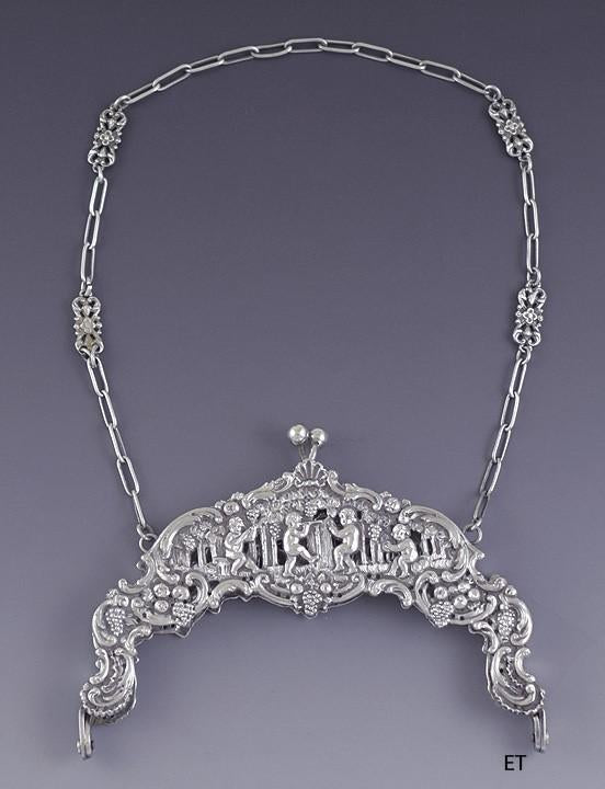 Presented is a wonderful vintage or antique silver purse frame, made in Rome in the 1910s-1930s. The frame is done in a beautiful openwork design featuring a classical genre scene of cavorting putti in a forest, surrounded by scrollwork and clusters of grapes and other fruit. All the decoration is richly detailed and well done, with fine hand engraved texturing. The frame has an attached chain consisting of long oval links interspersed with little silver filigree connectors with a design of flowers and scrolls, just as crisp and detailed as the frame itself. The frame has little holes around the bottom where a purse could be sewn into place, and would look equally lovely with a simple purse in a solid color of velvet or married to a vintage embroidered or beadwork piece.