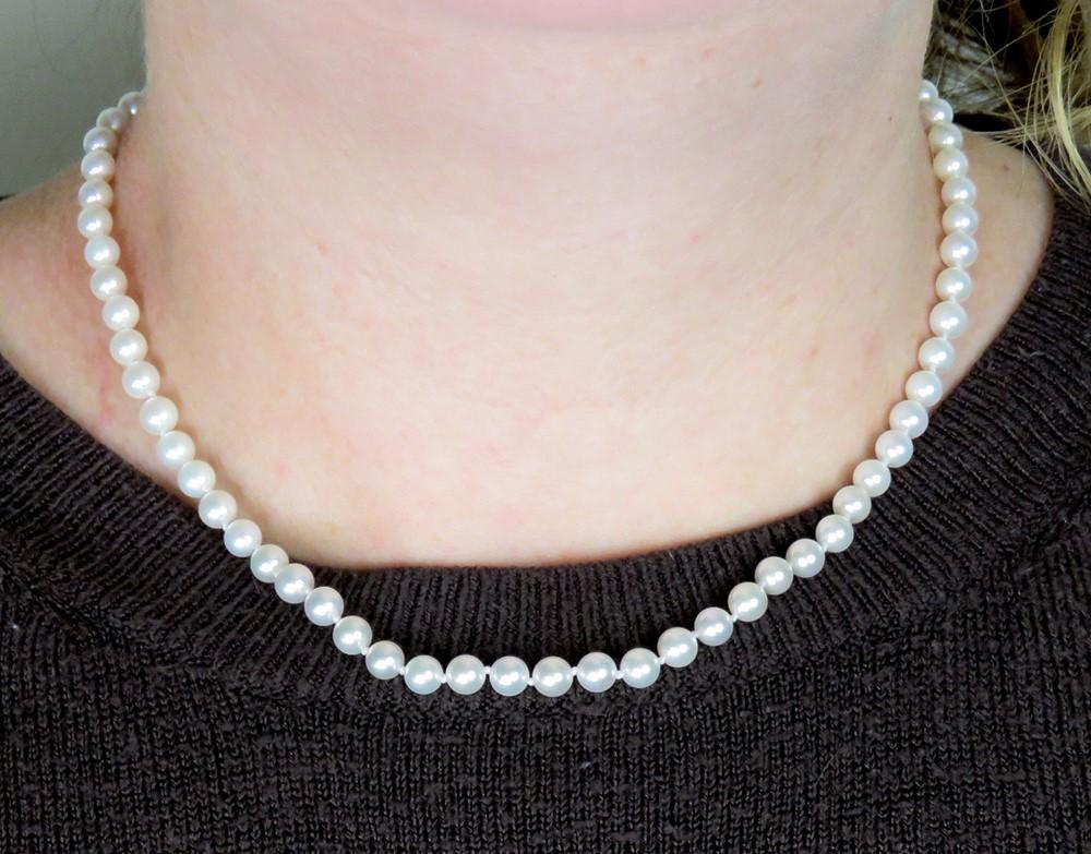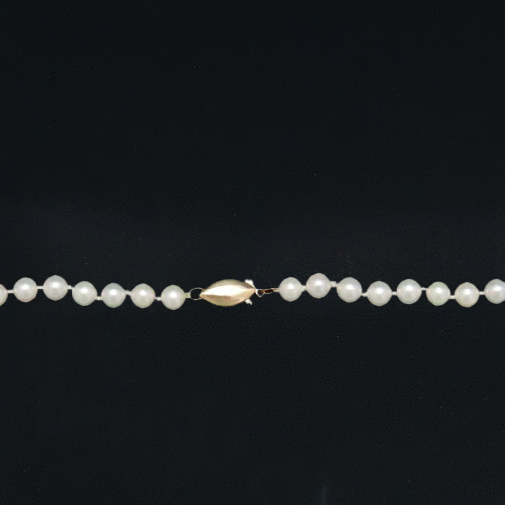 Presented is a lovely pearl necklace with a 14 karat yellow gold clasp. The necklace is comprised of a single strand of individually knotted pearls. The pearls are approximately 5.3 millimeters in diameter. The 14k gold clasp is very secure.