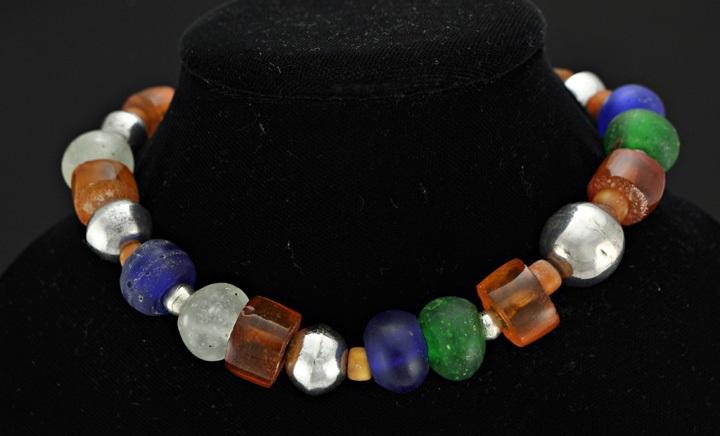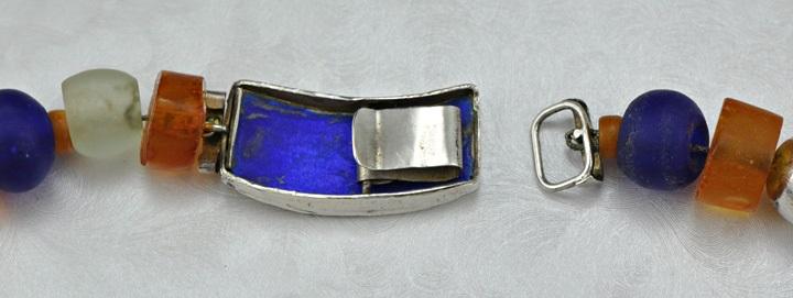 Presented is a great glass and silver beaded necklace. The glass beads are blue, green and orange. The silver beads are different sizes as well. The back clasp is beautifully enameled. The claps and the silver beads are sterling silver, acid tested and guaranteed.