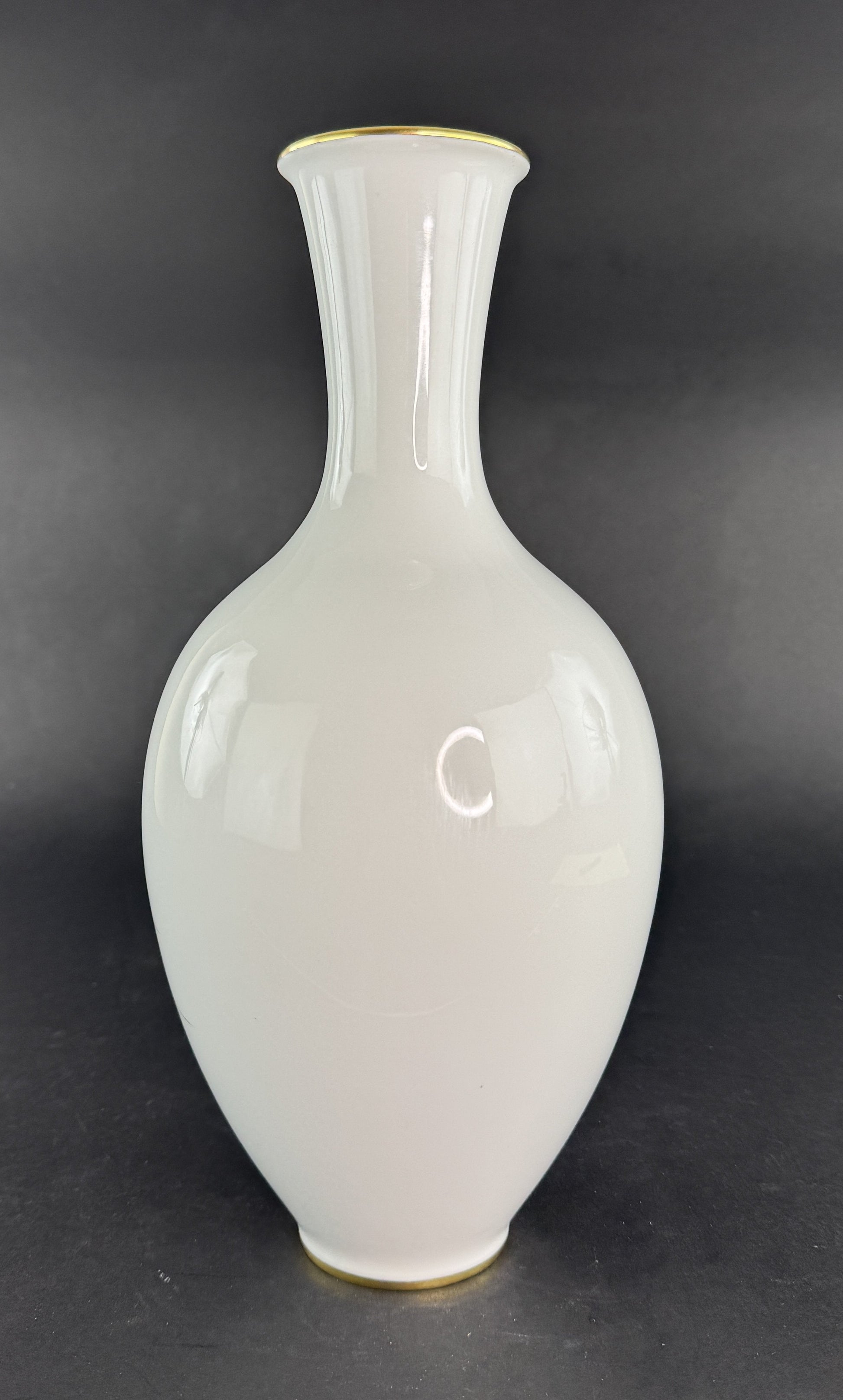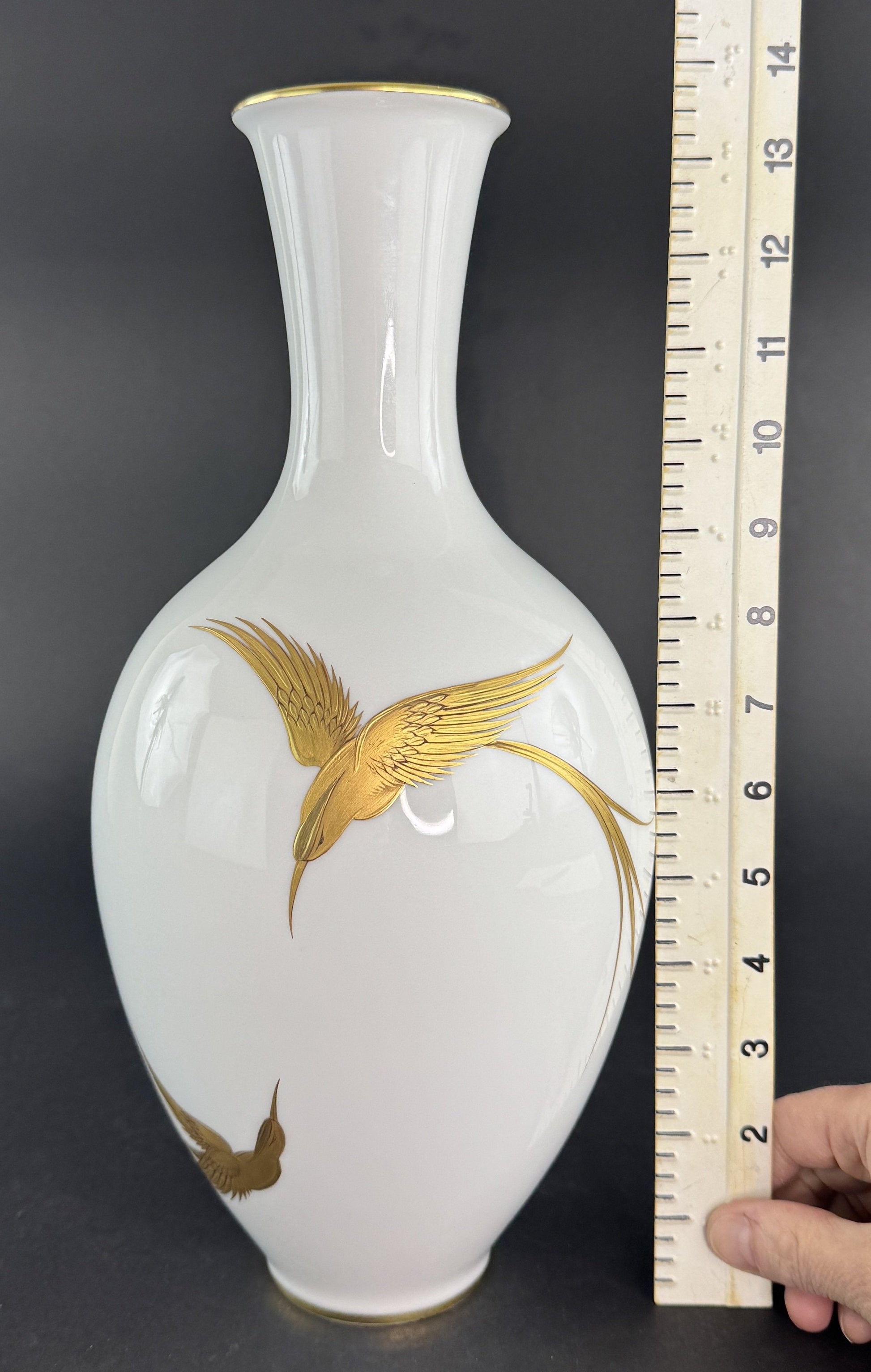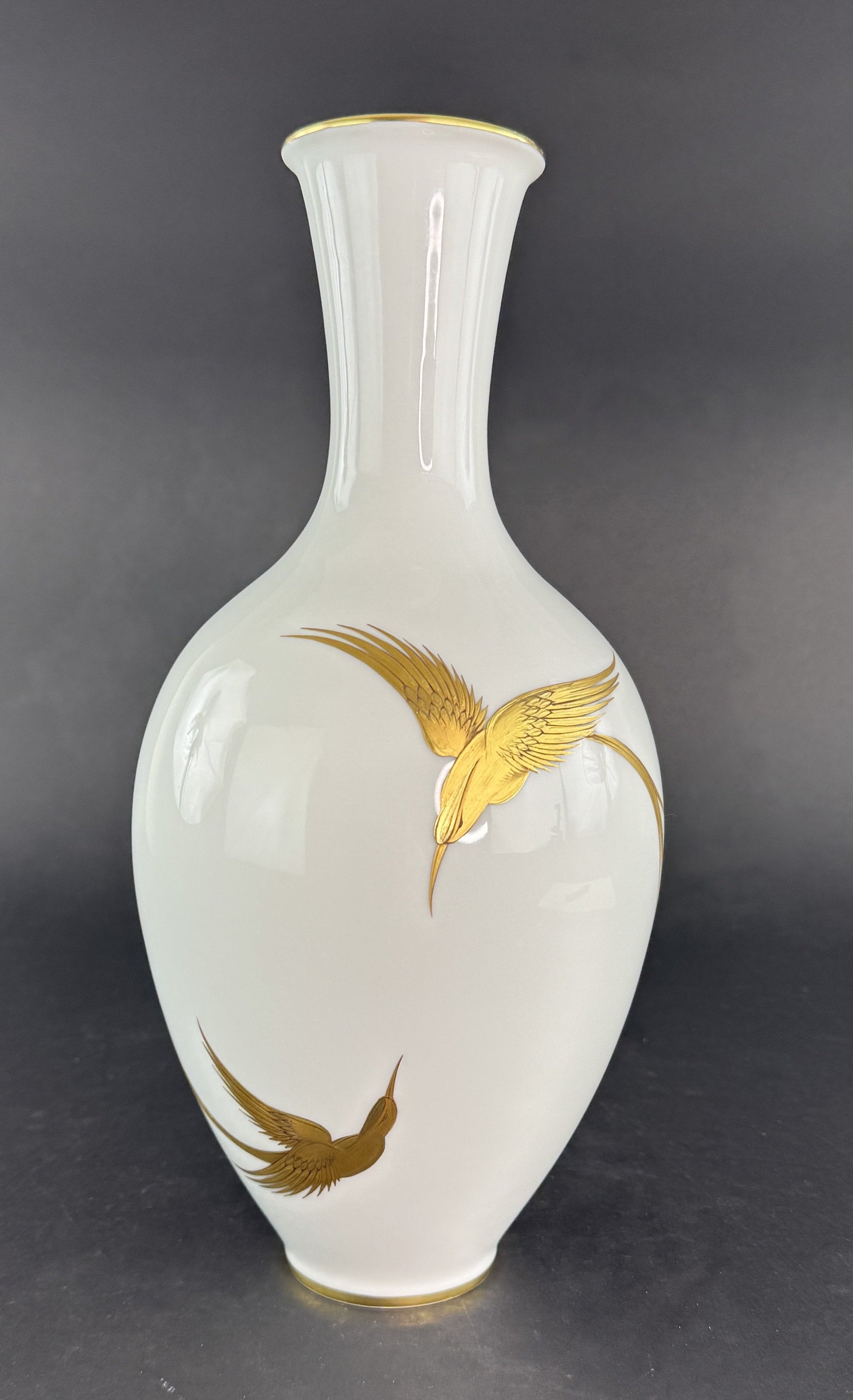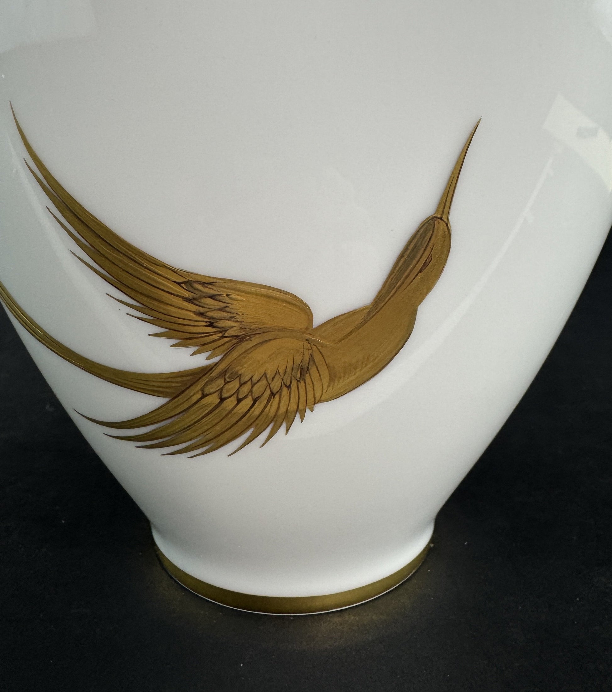 Presented is a beautiful modern German porcelain vase, by Heinrich & Co, Selb, Bavaria. The vase is made in an elegant high shouldered bottle form, beautifully hand painted with long tailed songbirds in rich gold. The birds are hand painted and very lively, shown in flight and with nice detail work for the feathers.