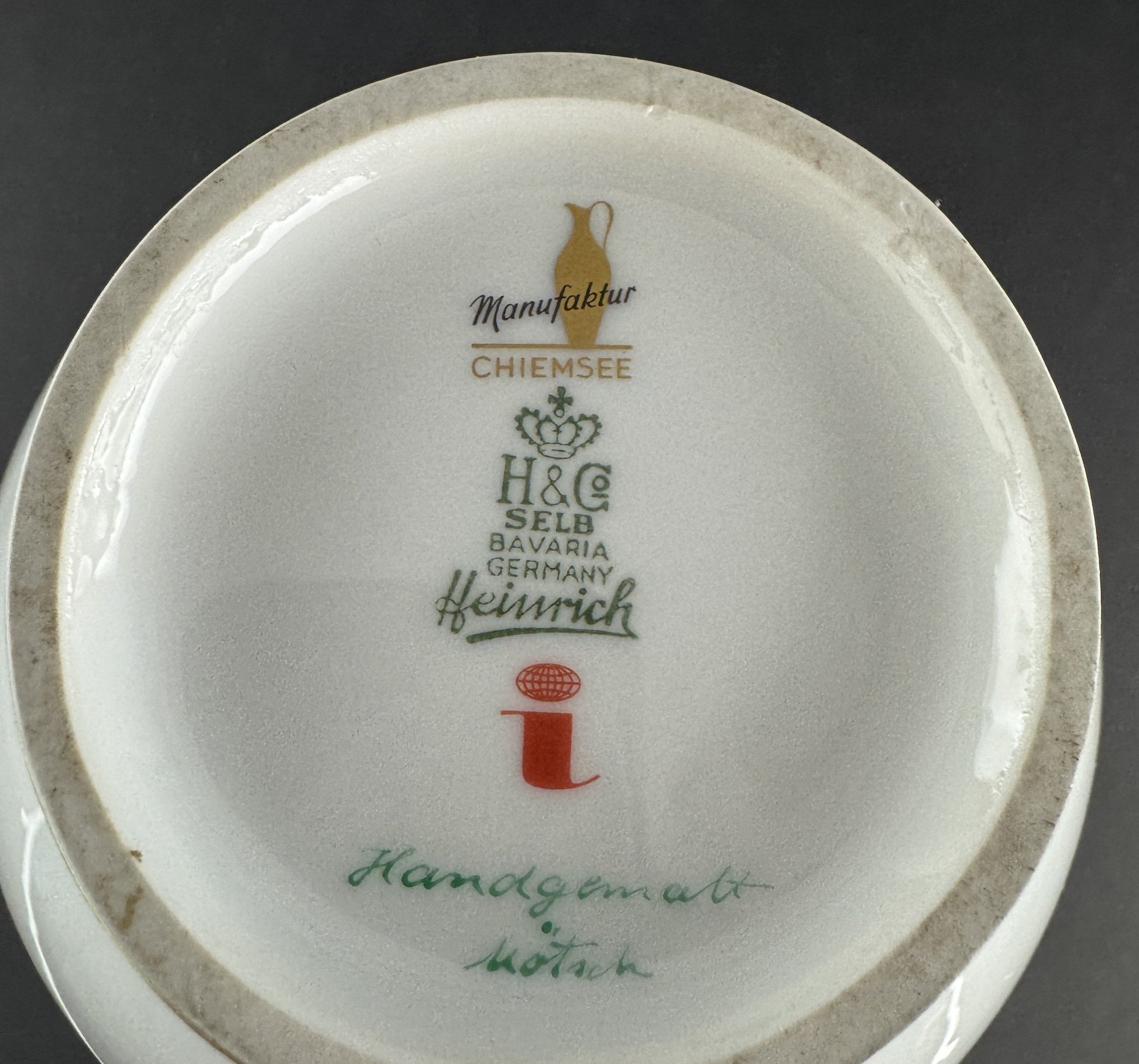 The underside is signed H&Co, Selb, Bavaria, Heinrich, as well as “handgemalt” (hand painted), Chiemsee, and manufaktur.