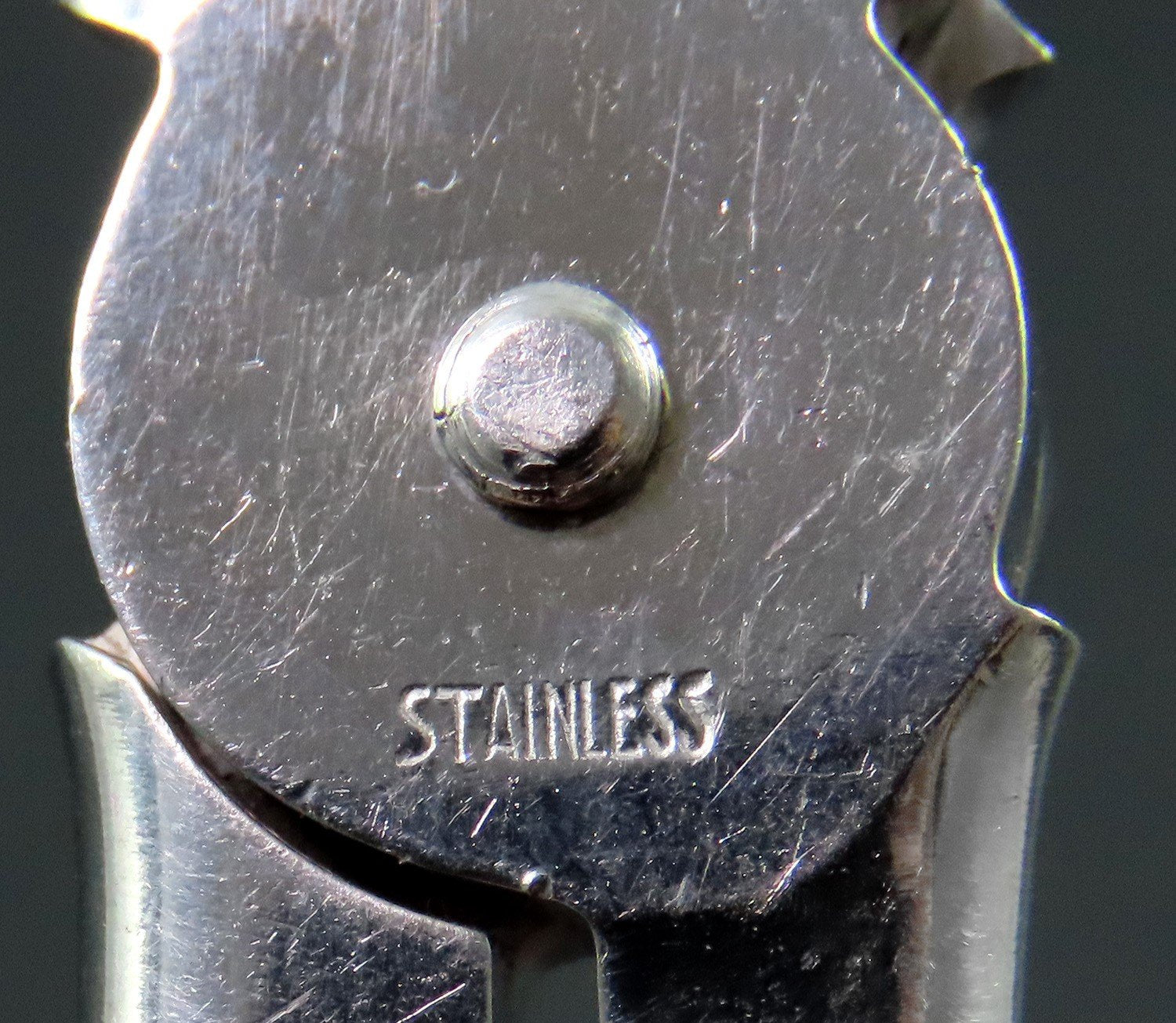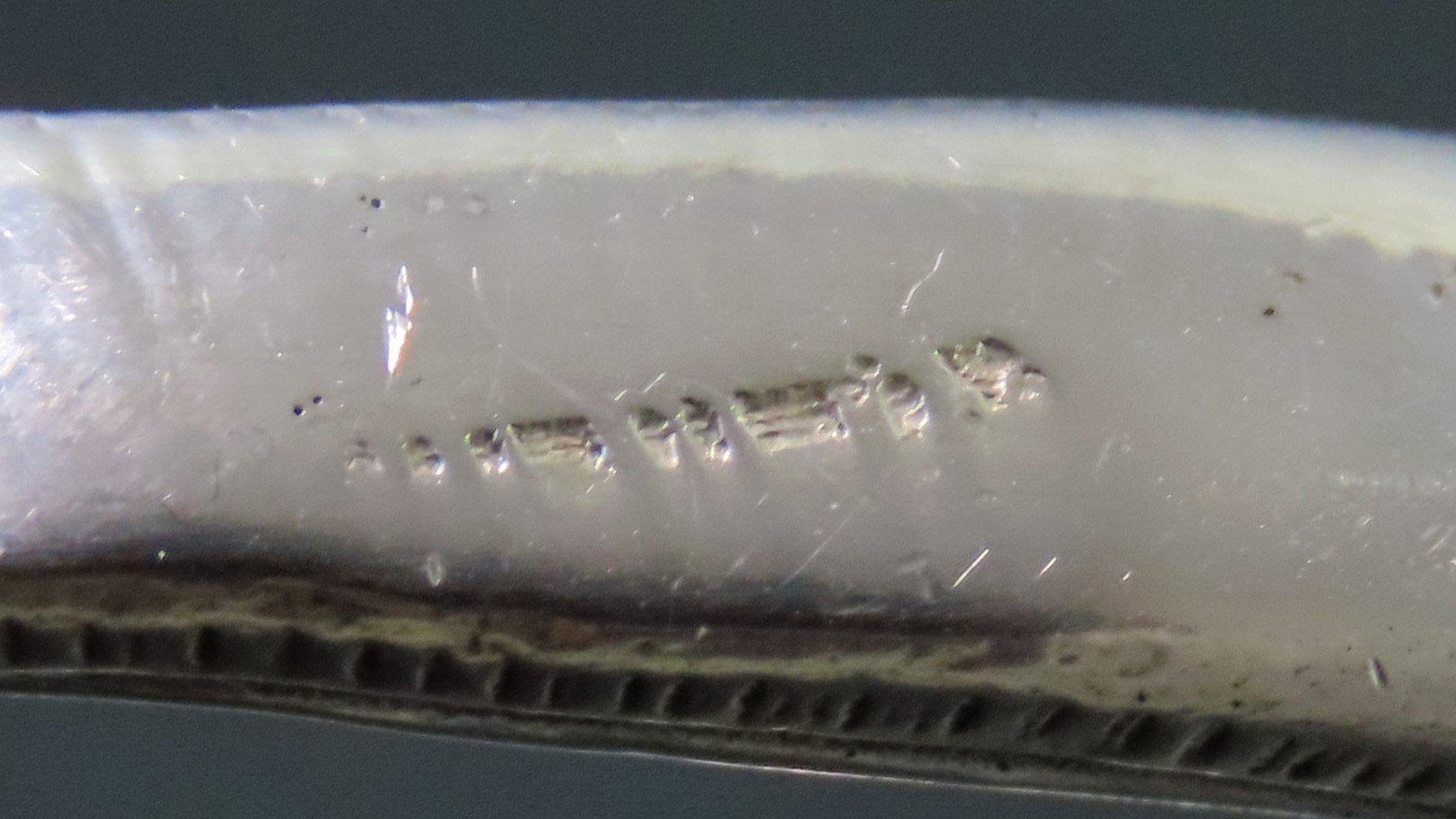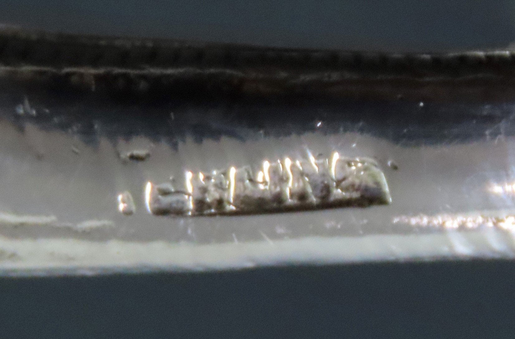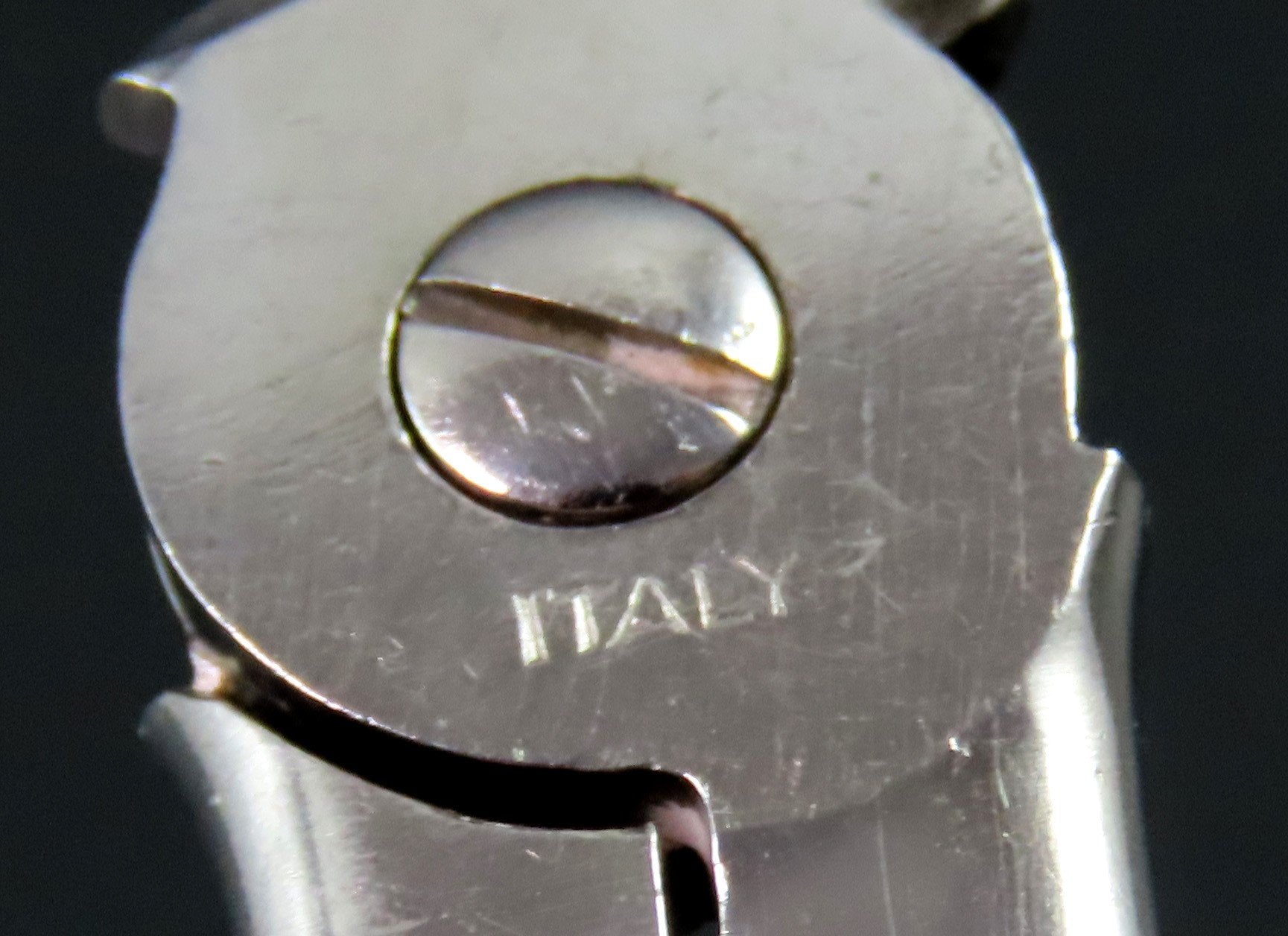 The handles are stamped sterling, though the stamps are hard to read; we have verified that the handles are silver via testing with nitric acid. The blades are marked stainless and Italy.