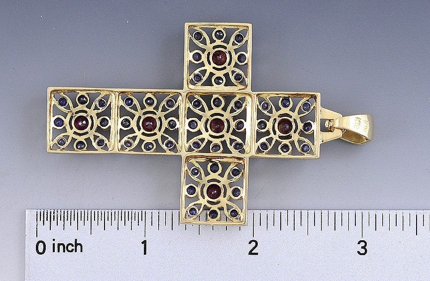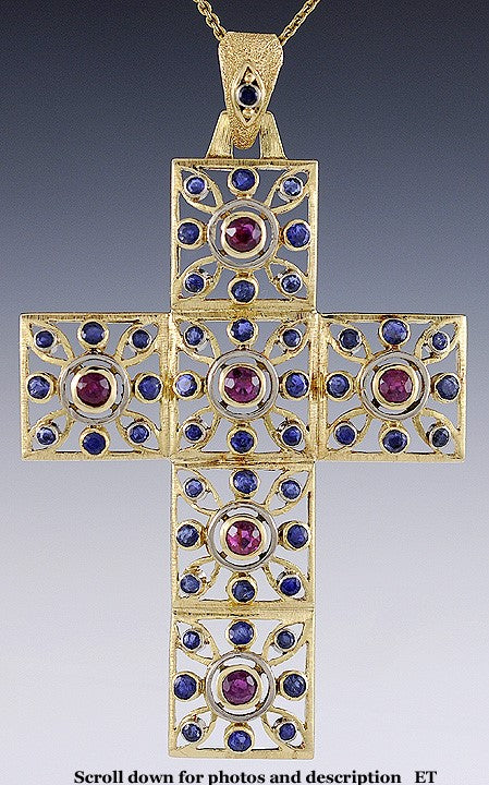 Presented is an incredible, 18 karat deep yellow gold, sapphire and ruby cross. This piece is South American or Italian in origin. The cross is securely bezel set with approximately 1 carat in rubies and 1 1/2 carats of sapphires. There are platinum or white gold rings of design surrounding the rubies. The whole piece is done in a nice, openwork form and the bale or loop is textured with a stippled finish.