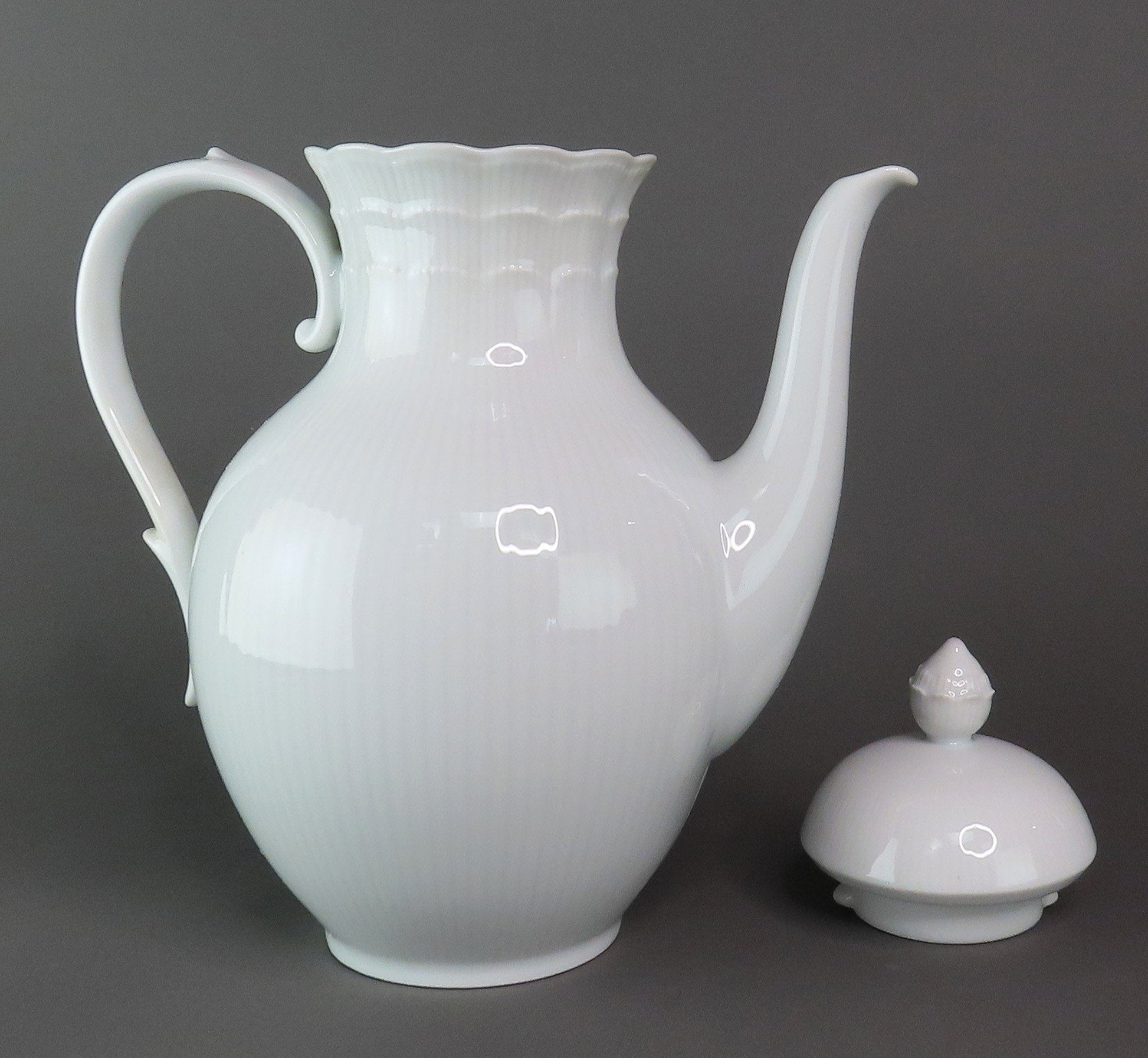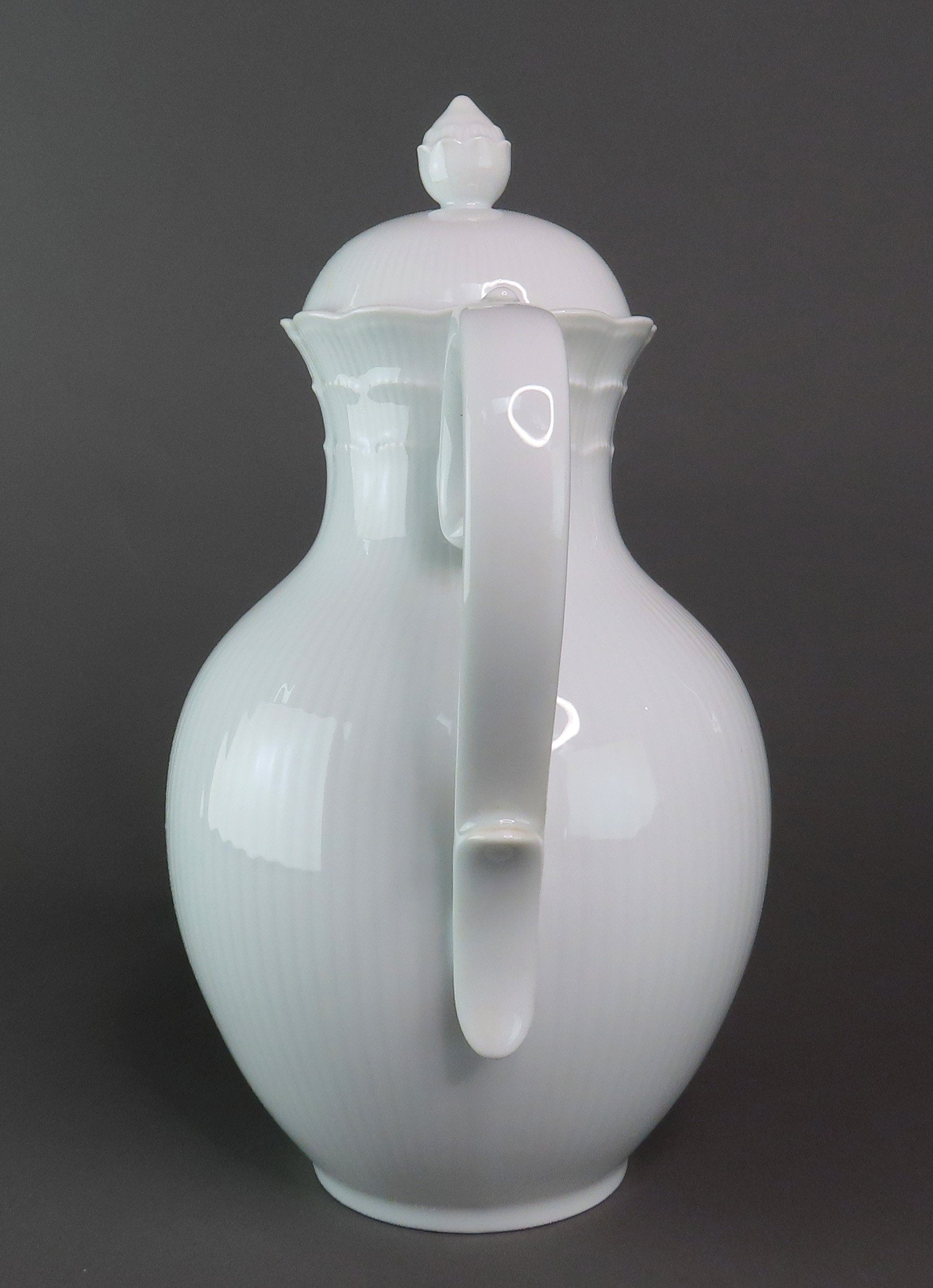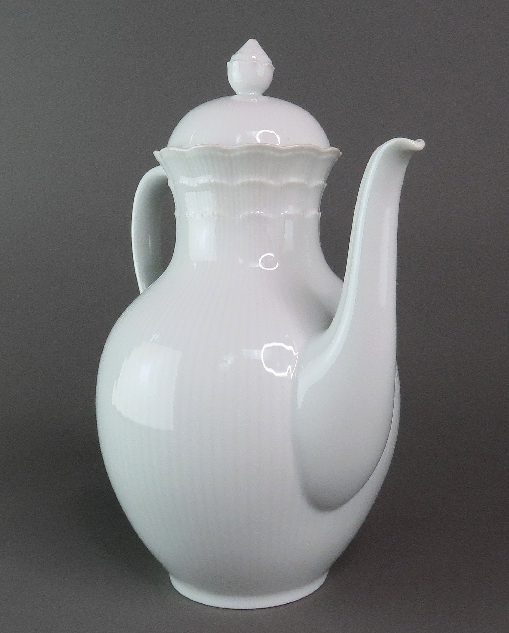 Presented is a beautiful porcelain coffee pot from Kaiser. This piece is in the Romantica pattern, which was produced between 1988-2004. This pattern displays a scalloped edge with subtle vertical ribbing around the piece and the border of the lid. There is a nice finial on top and grand handle.