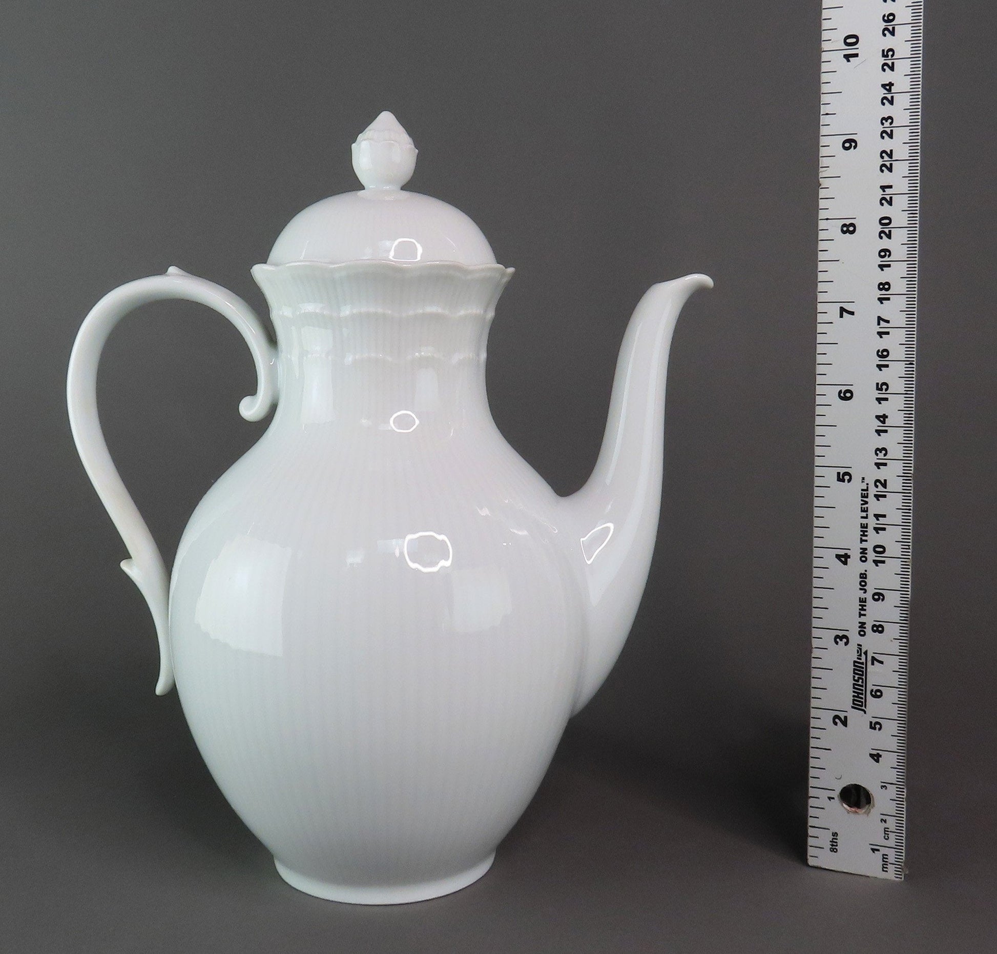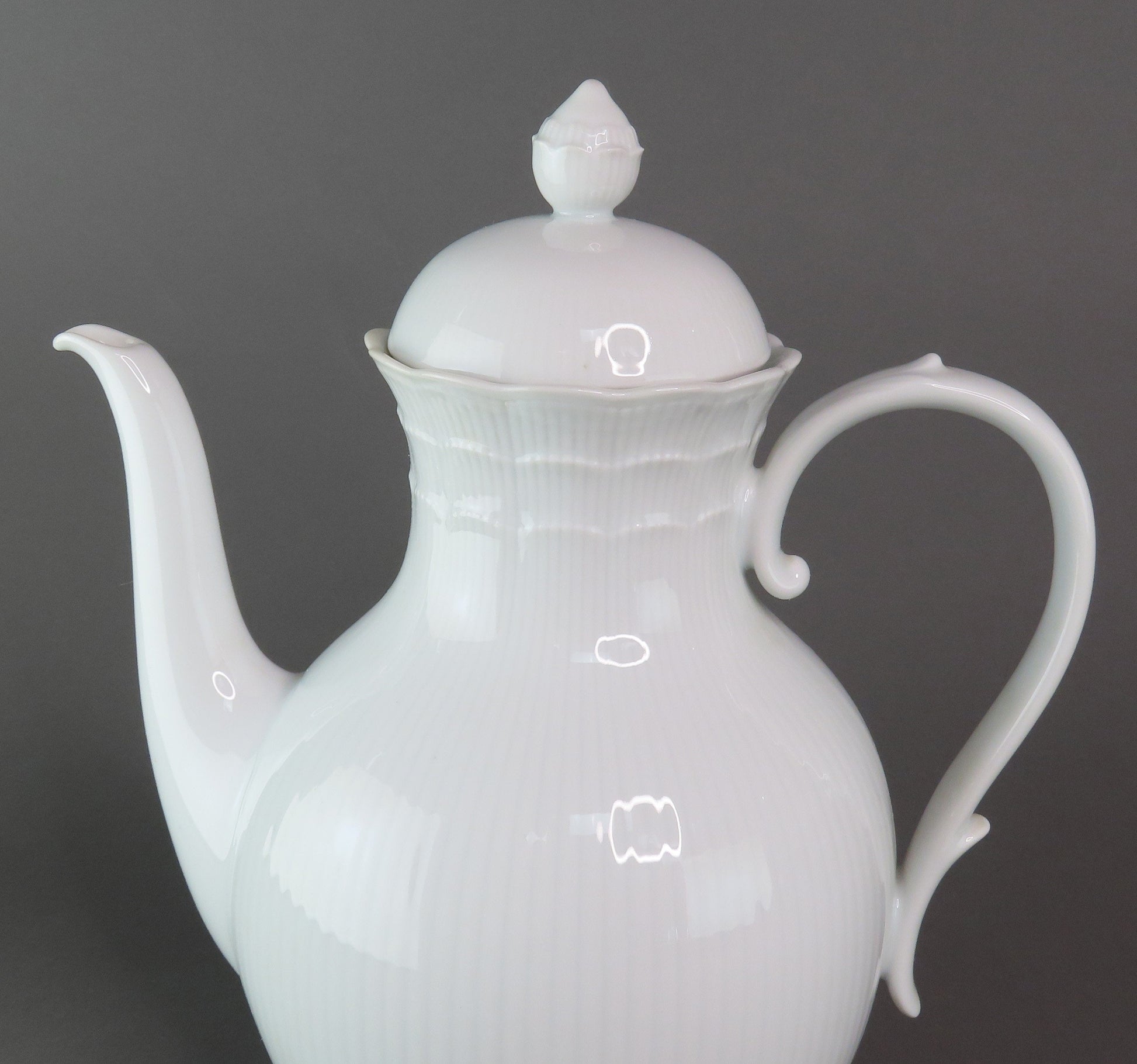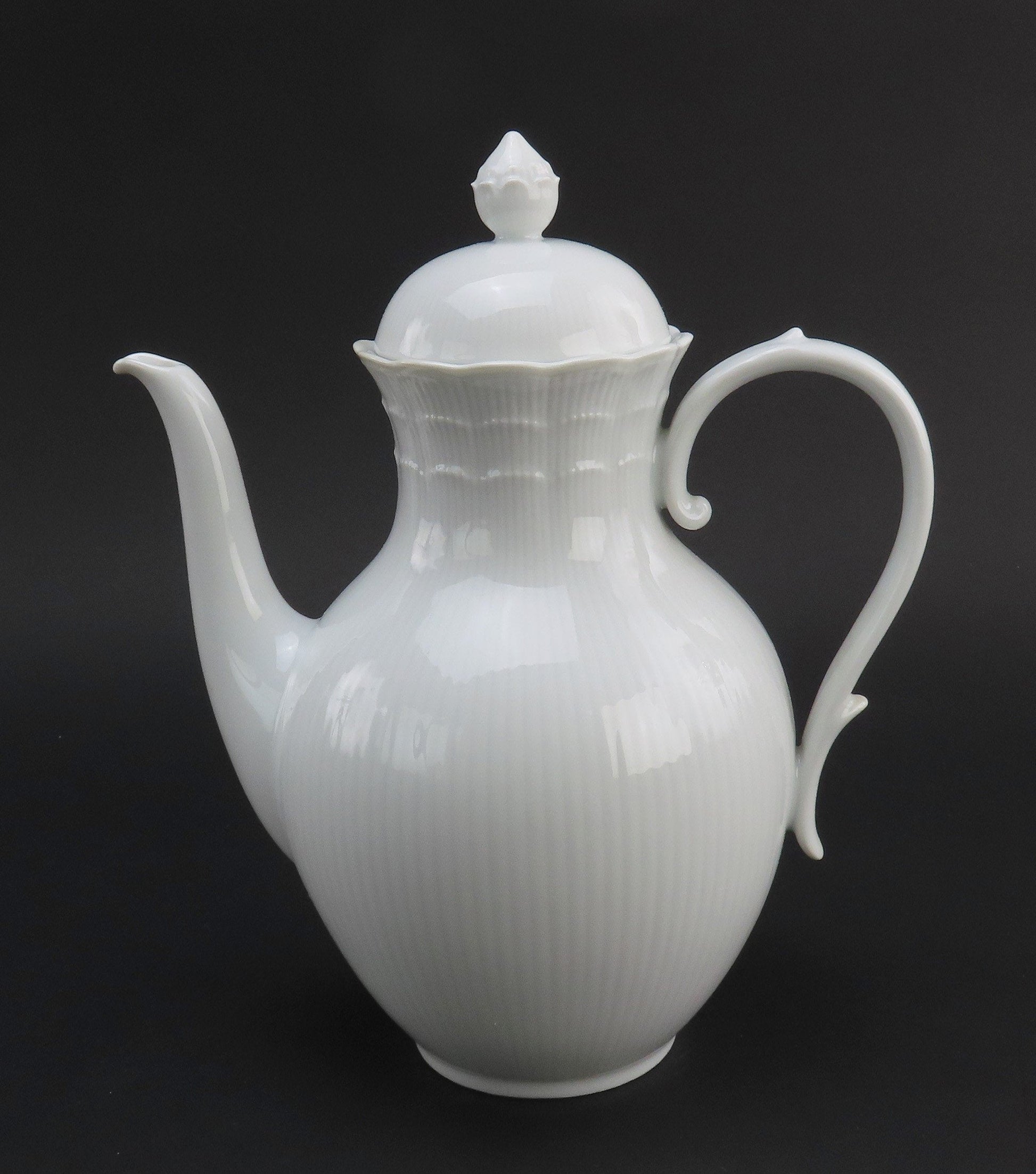 Presented is a beautiful porcelain coffee pot from Kaiser. This piece is in the Romantica pattern, which was produced between 1988-2004. This pattern displays a scalloped edge with subtle vertical ribbing around the piece and the border of the lid. There is a nice finial on top and grand handle.