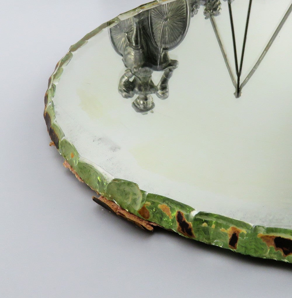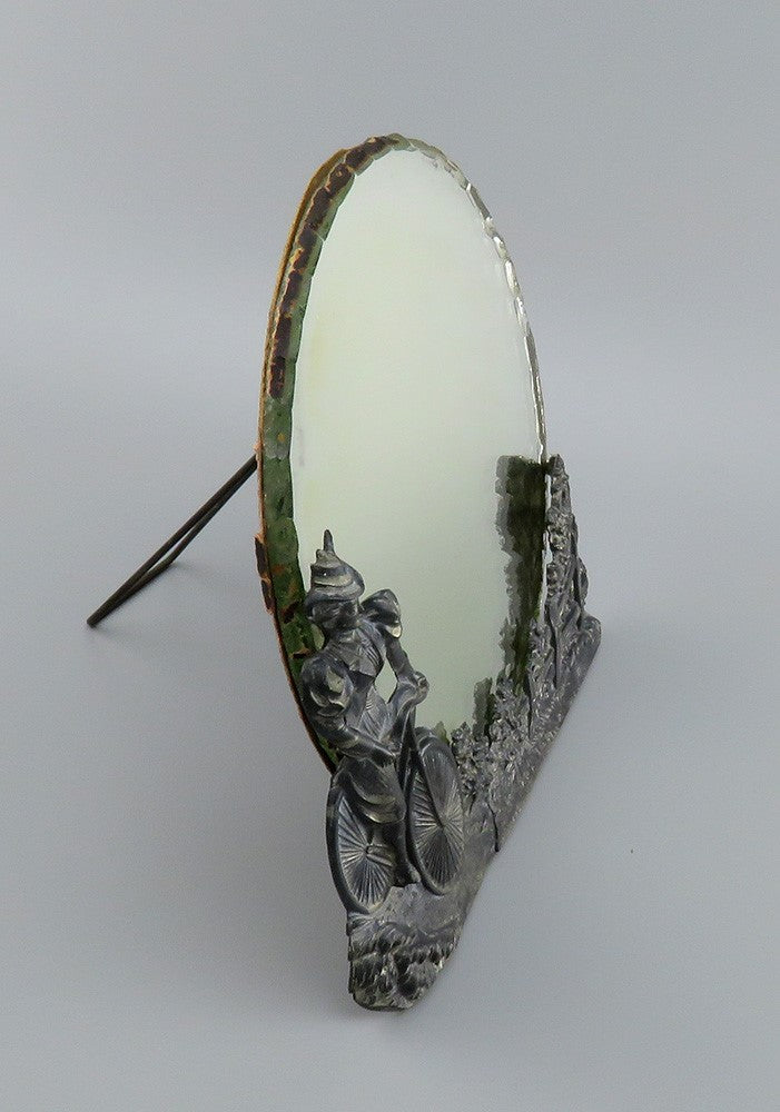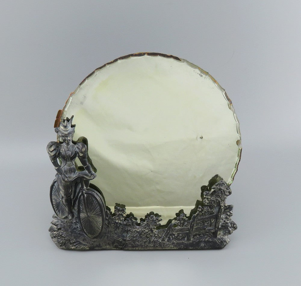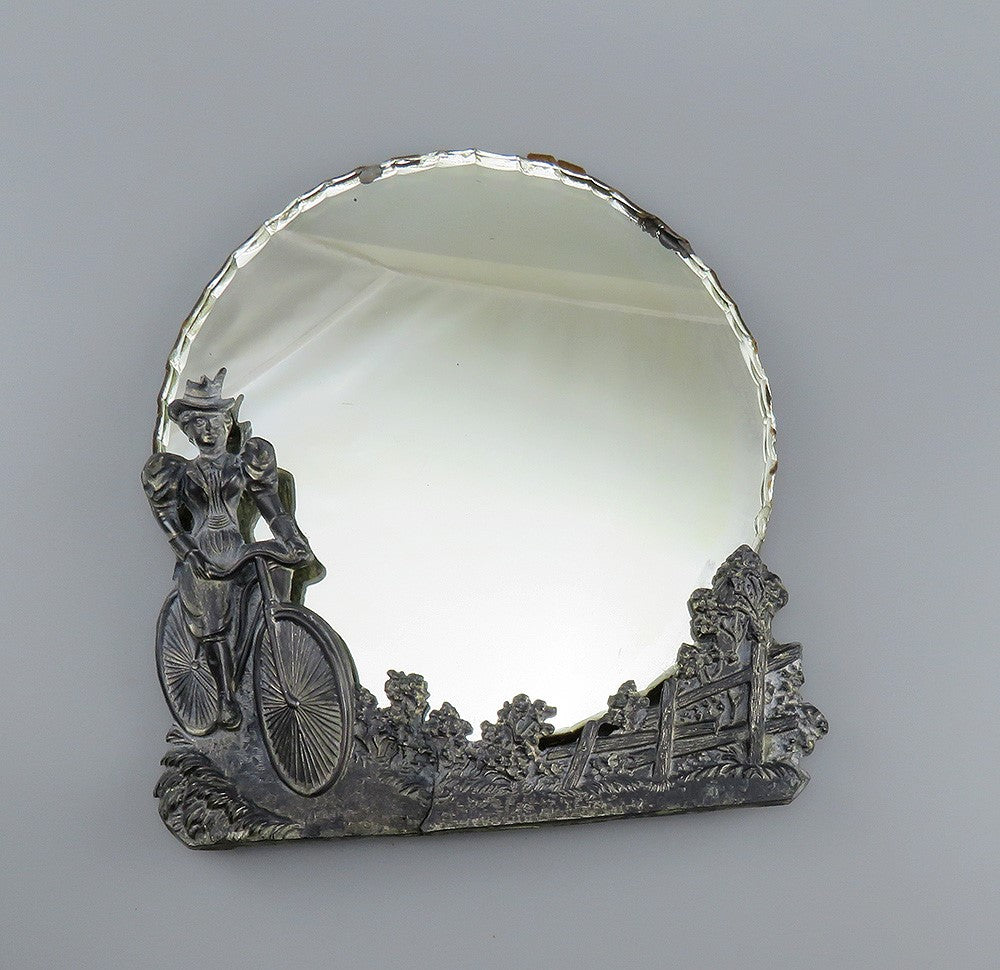 Presented is a beautiful easel back mirror from 1896. This piece has a round mirror with a scalloped edge. It it likely that this edge was once wrapped. The metal easel, which is probably silver-plated, displays a woman on a bicycle going down a path with bushes and a fence. The metal details are crisp and clean.