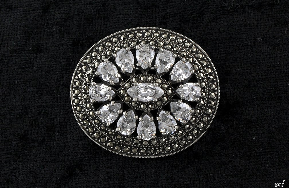 The pin features large tear drop and marquis shaped synthetic stones with marcasites set all around the outside.