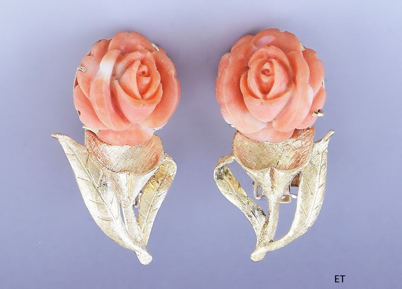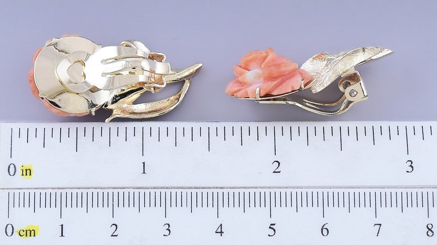 Beautiful pair 14k Gold & Carved Coral Rose Clipback Earrings