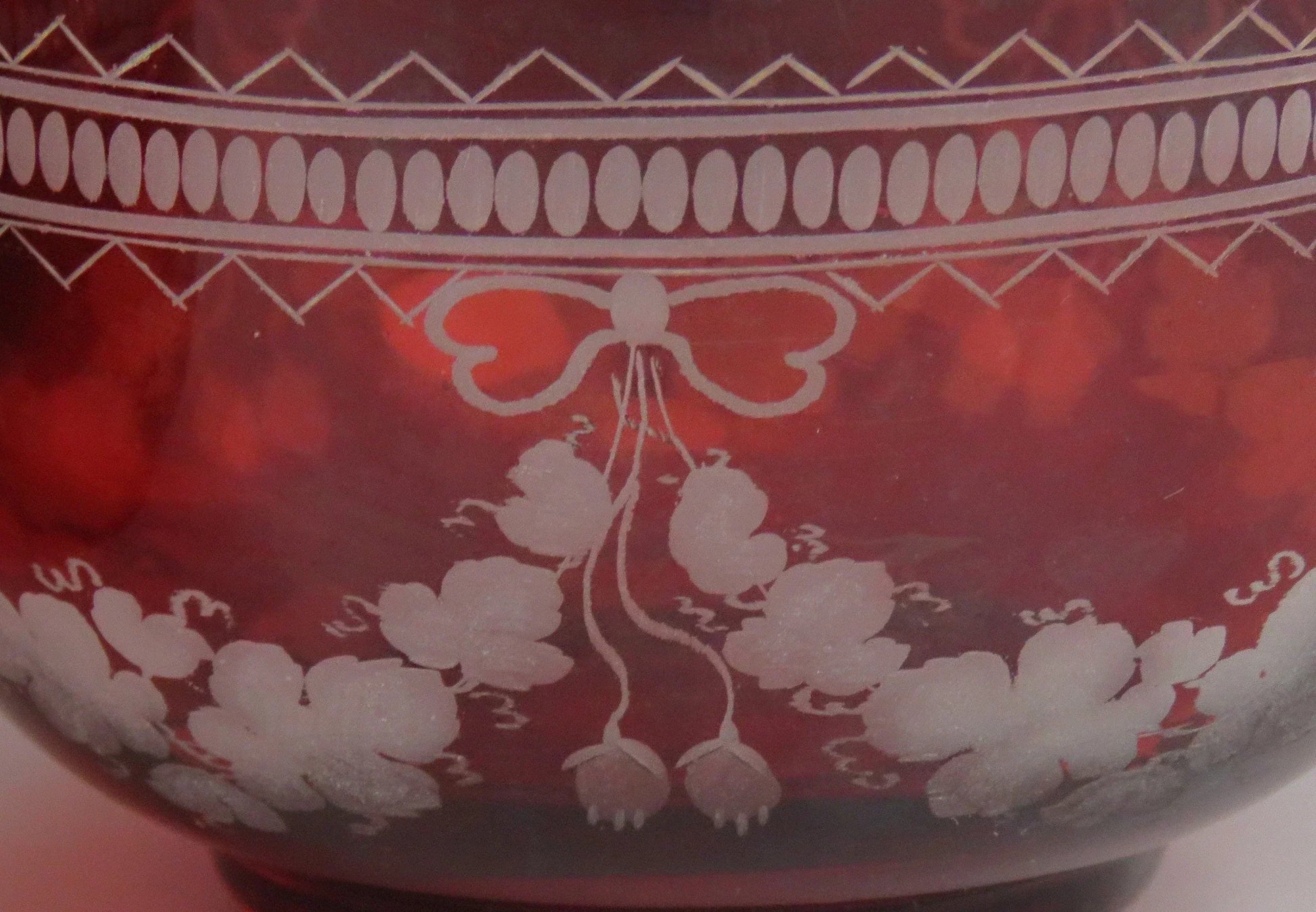 ruby glass with cut and frosted decoration around the sides.