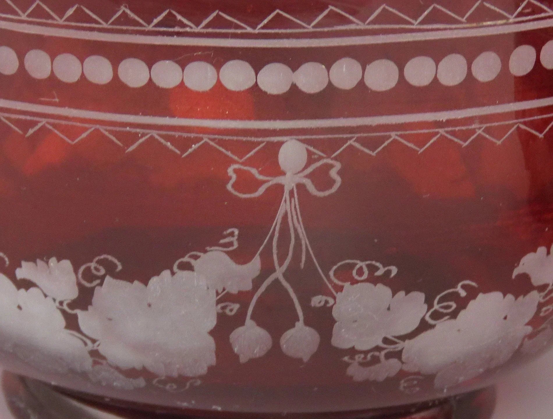 ruby glass with cut and frosted decoration around the sides. The decorations